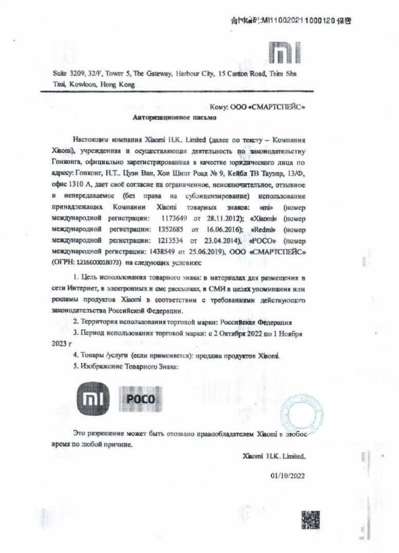 Сертификат соответствия ЕАЭС. Гарантия 12 месяцев в сервисных центрах Xiaomi.