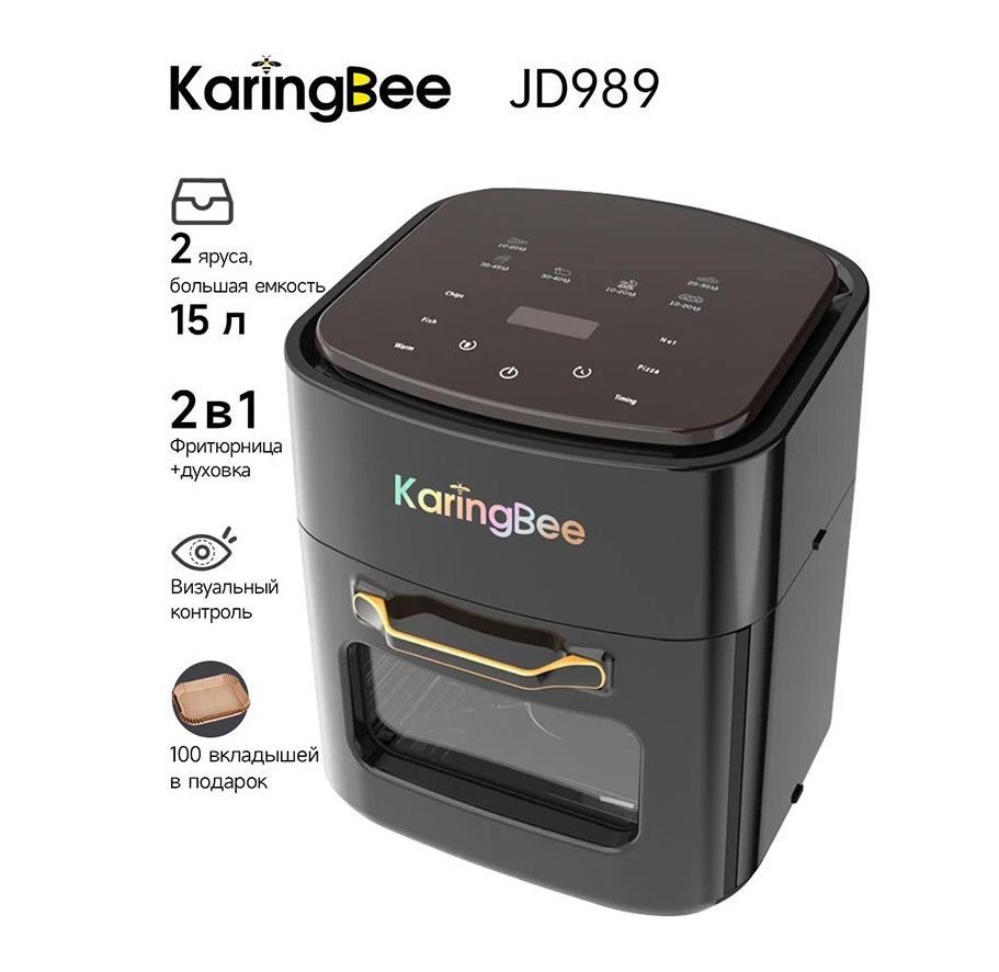 Аэрофритюрница KaringBee JD989 в стильном черном цвете – ваш надежный помощник в кулинарии. Устройство позволяет готовить любимые блюда при минимальном использовании масла, благодаря применению технологии горячего воздушного потока. Емкость 4 литра, регулируемый термостат, таймер и шесть быстрых программ позволяют легко и быстро готовить разные виды блюд. Корпус из прочного пластика.