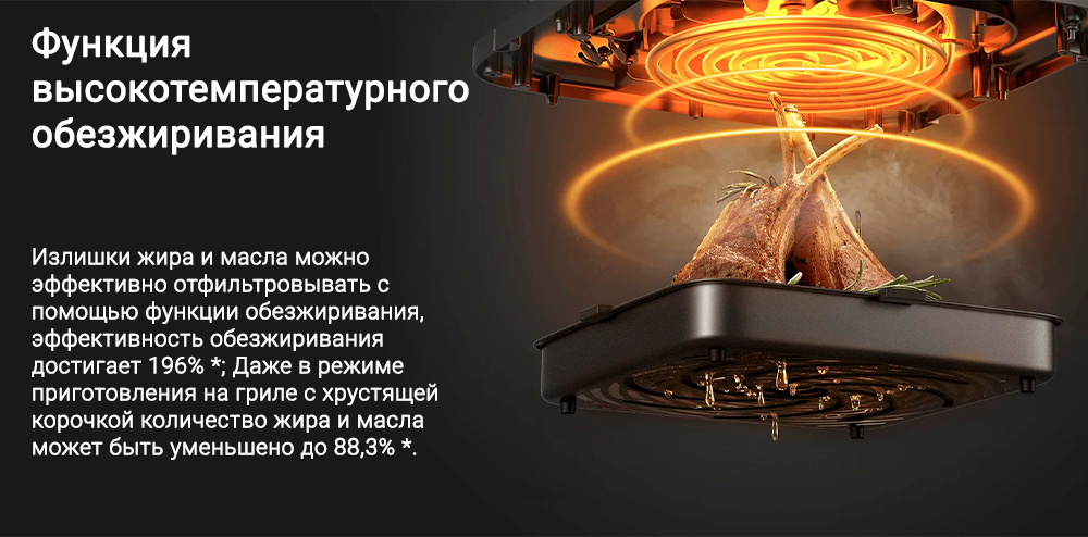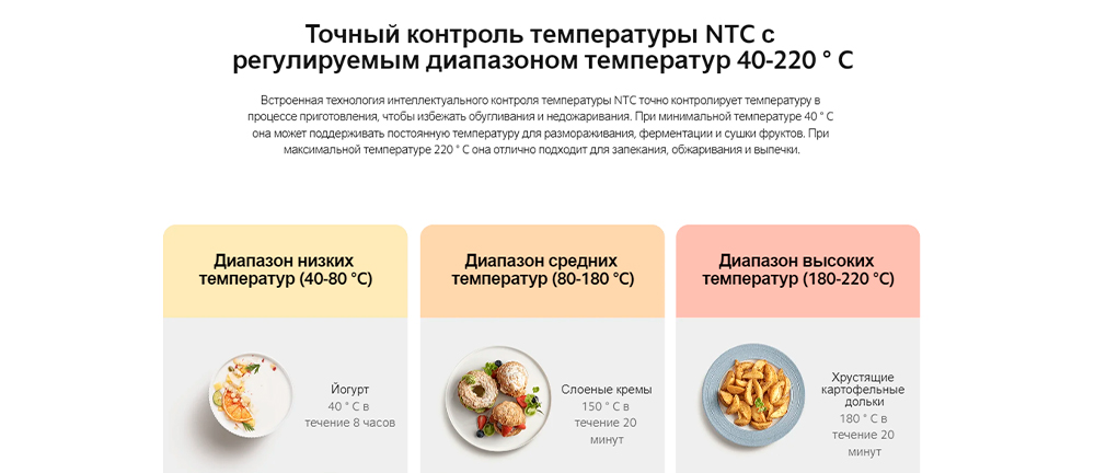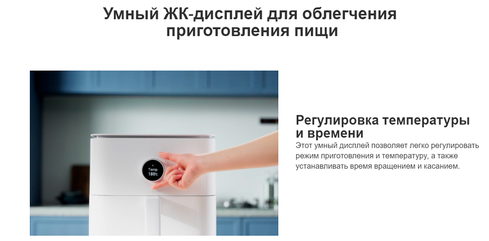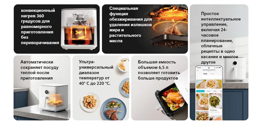 | Особенности | Специальная функция обезжиривания для удаления излишков жира и растительного масла, конвекционный нагрев 360 градусов, Автоматически сохраняет посуду теплой после приготовления, рецепты в приложении Mi Home, Планирование готовки на 24 часа |