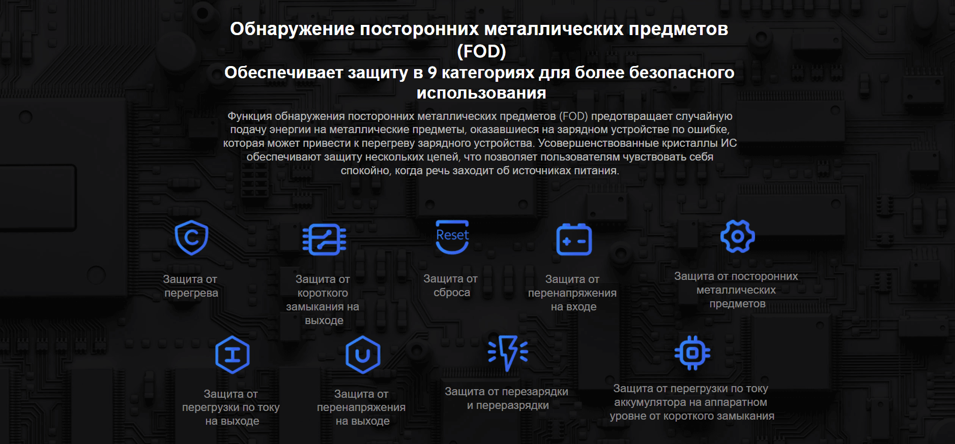 Функция обнаружения посторонних металлических предметов (FOD) предотвращает случайную подачу энергии на металлические предметы, оказавшиеся на зарядном устройстве по ошибке, которая может привести к перегреву зарядного устройства. Усовершенствованные кристаллы ИС обеспечивают защиту нескольких цепей, что позволяет пользователям чувствовать себя спокойно, когда речь заходит об источниках питания.