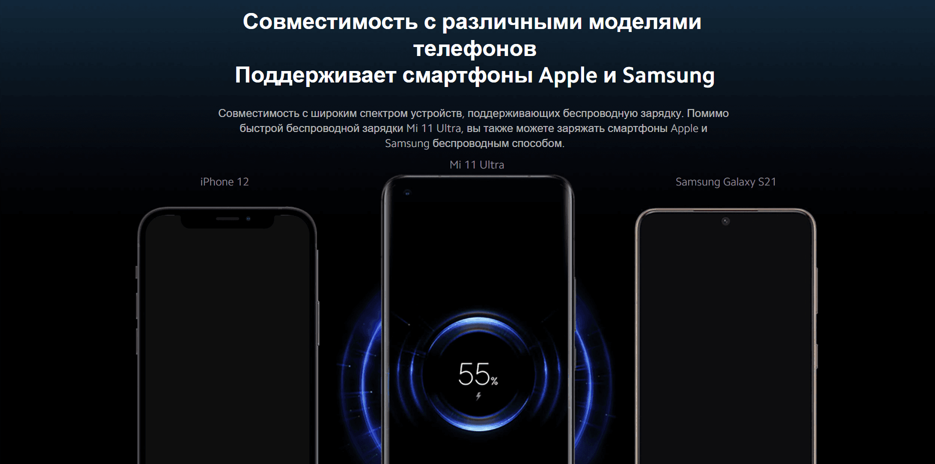 Совместимость с широким спектром устройств, поддерживающих беспроводную зарядку. Помимо быстрой беспроводной зарядки Mi 11 Ultra, вы также можете заряжать смартфоны Apple и Samsung беспроводным способом.