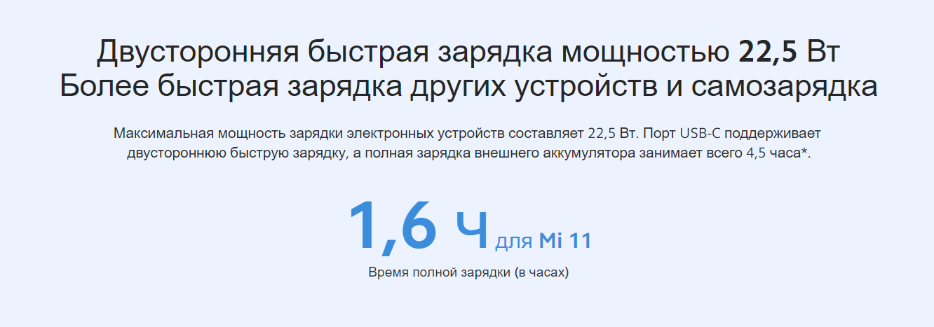 Максимальная мощность зарядки электронных устройств составляет 22,5 Вт. Порт USB-C поддерживает двустороннюю быструю зарядку, а полная зарядка внешнего аккумулятора занимает всего 4,5 часа.
