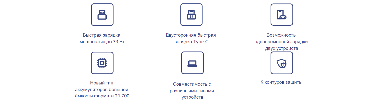 | Type-C | 5 В⎓3 А 9 В⎓3 А 12 В⎓2,25 А 11 В⎓3 А МАКС. |