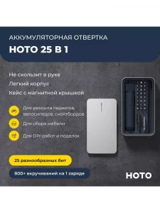 Упакованный в компактный и эргономичный корпус, этот кит отверток HOTO удобен для переноски и хранения. Главное его отличие от других моделей – это долгий срок службы батареи и прочная конструкция. С его помощью вы сможете справиться со всеми поставленными задачами.