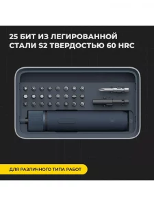 | Комплектация | Аккумуляторная отвёртка, набор из 25 бит, упаковка. |