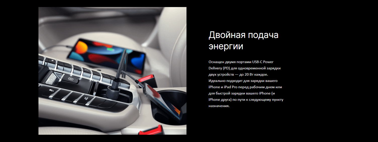 Оснащен двумя портами USB-C Power Delivery (PD) для одновременной зарядки двух устройств – до 20 Вт каждое. Идеально подходит для вашего iPhone и iPad Pro перед рабочим днем или для быстрой зарядки вашего iPhone (и iPhone друга) по пути к следующему пункту назначения.