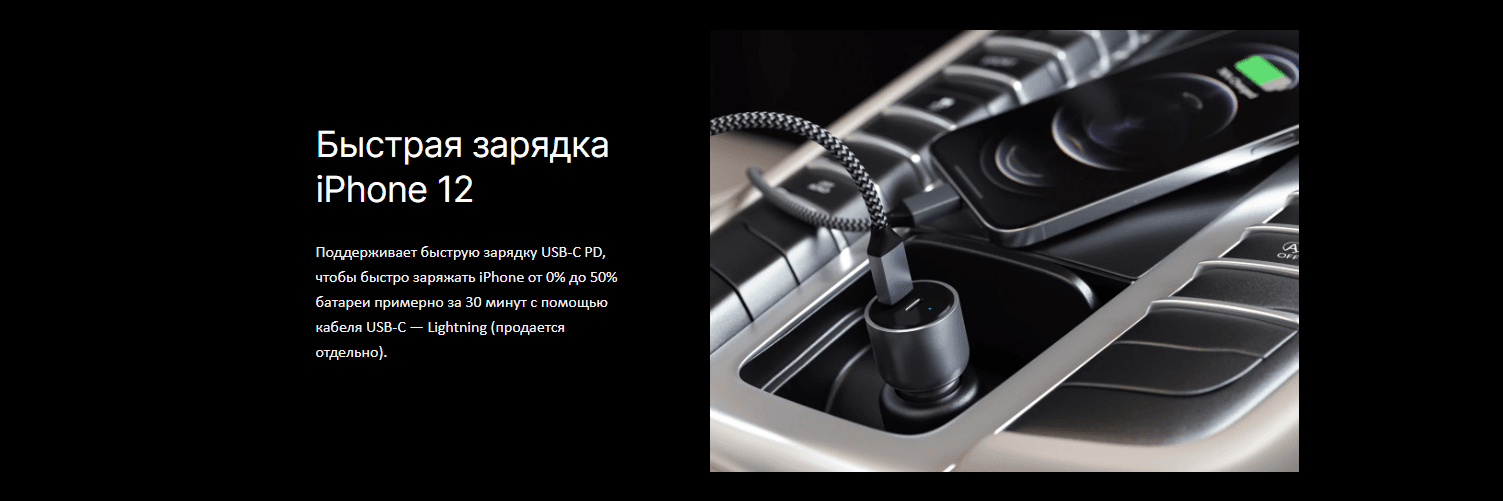 Поддерживает быструю зарядку USB-C (PD), чтобы быстро заряжать iPhone от 0% до 50% батареи примерно за 30 минут с помощью кабеля USB-C Lightning (продается отдельно).