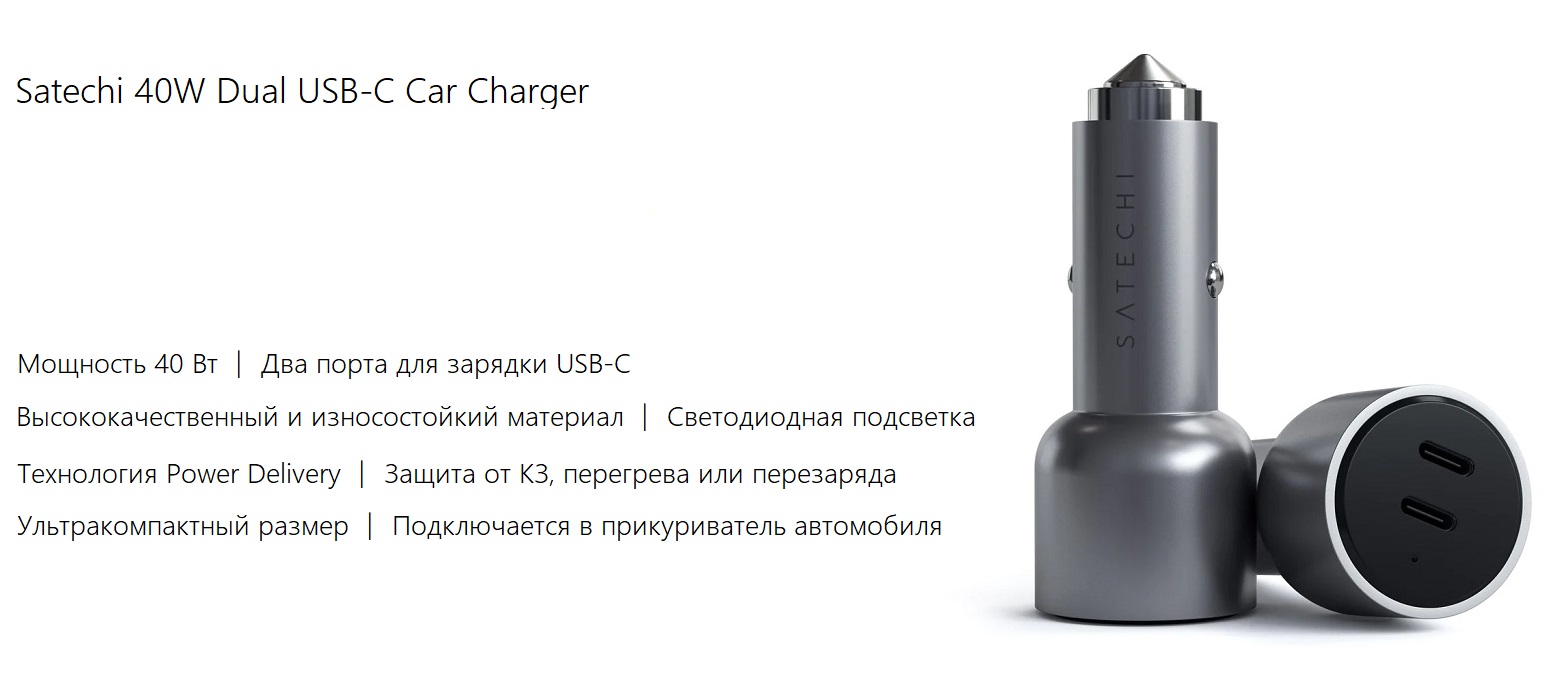 | Комплектация | Автомобильное зарядное устройство Satechi 40W Dual USB-C Car Charger |