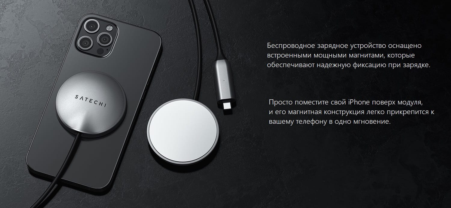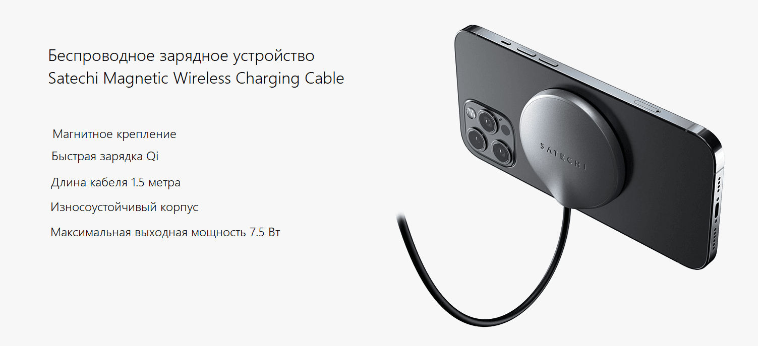 Беспроводное зарядное устройство Satechi Magnetic Wireless Charging Cable. Интерфейс Type-C, длина 1.5м. Цвет: серый космос.