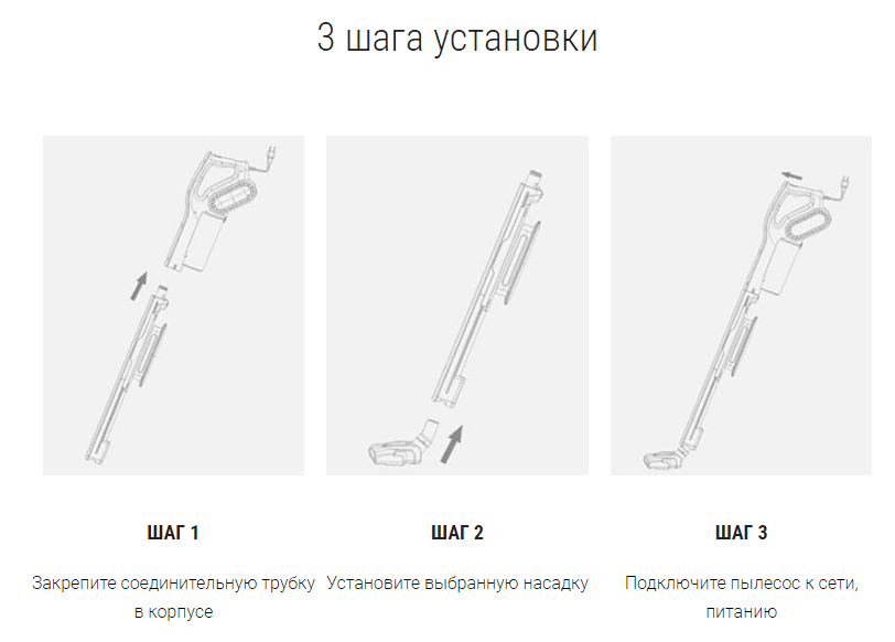 | Комплектация | Пылесос, насадки (3 шт), руководство пользователя |