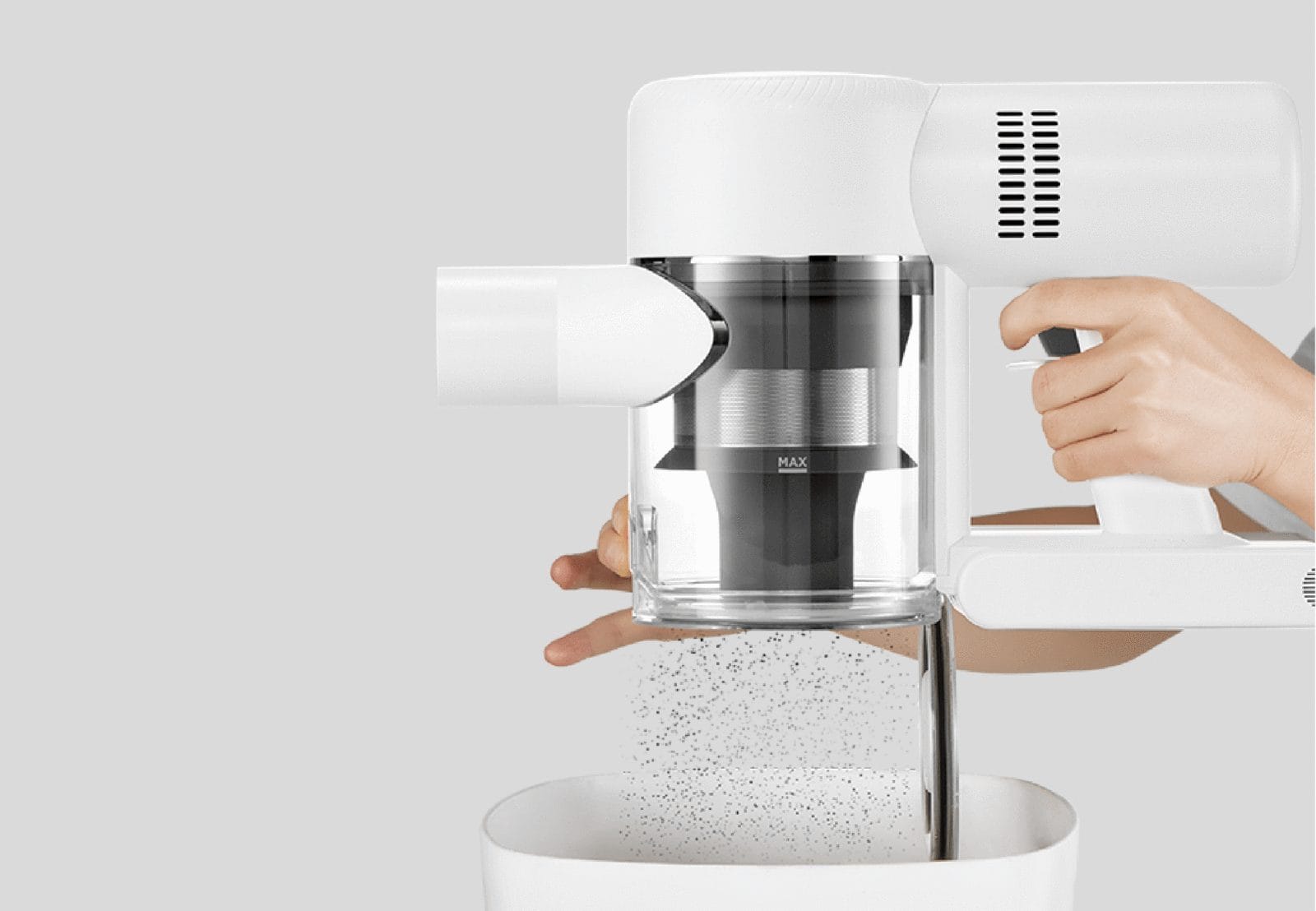 Больше не нужно лезть в пылесборник и прикасаться к грязи – достаточно нажать кнопку, вытащить контейнер и высыпать содержимое в пакет с мусором.