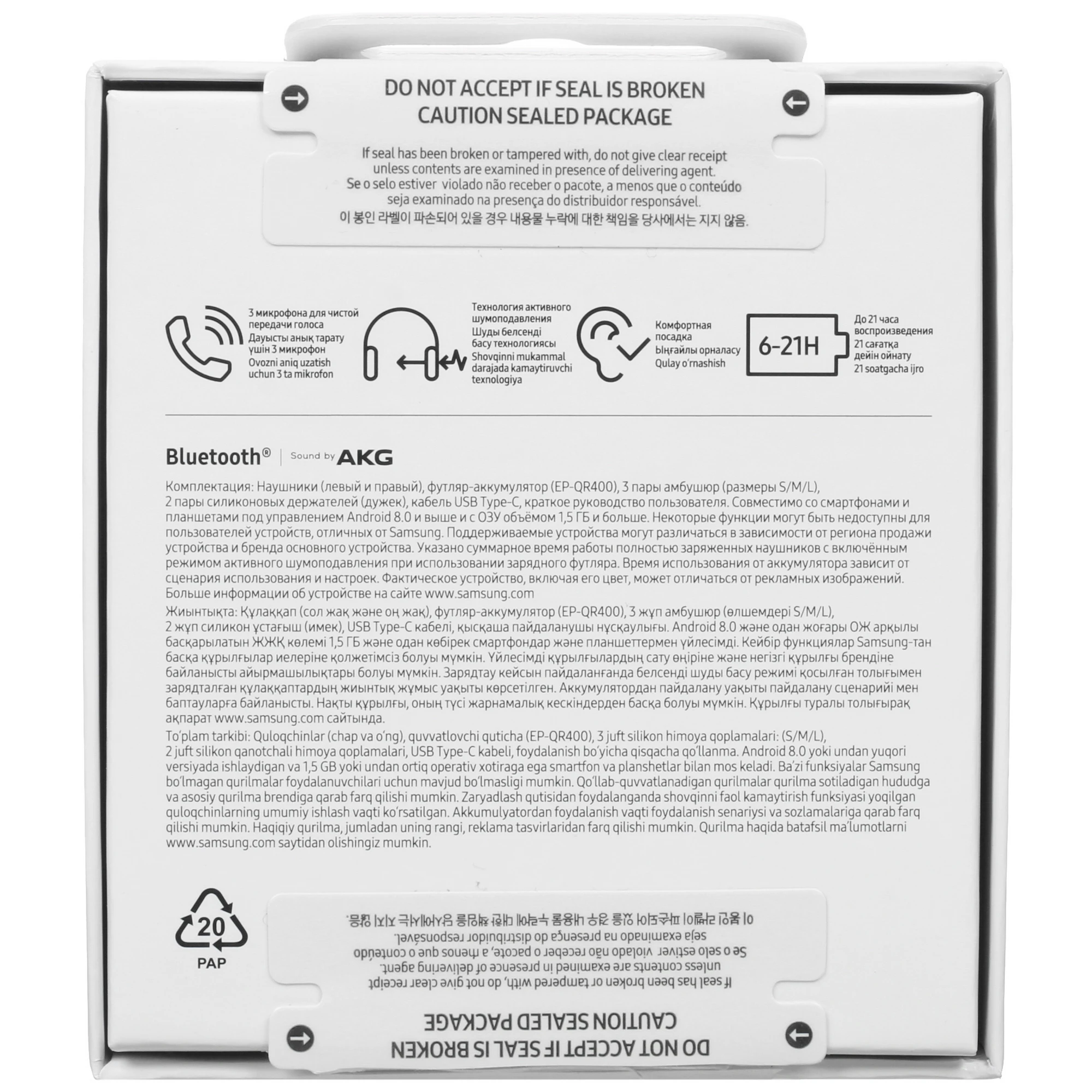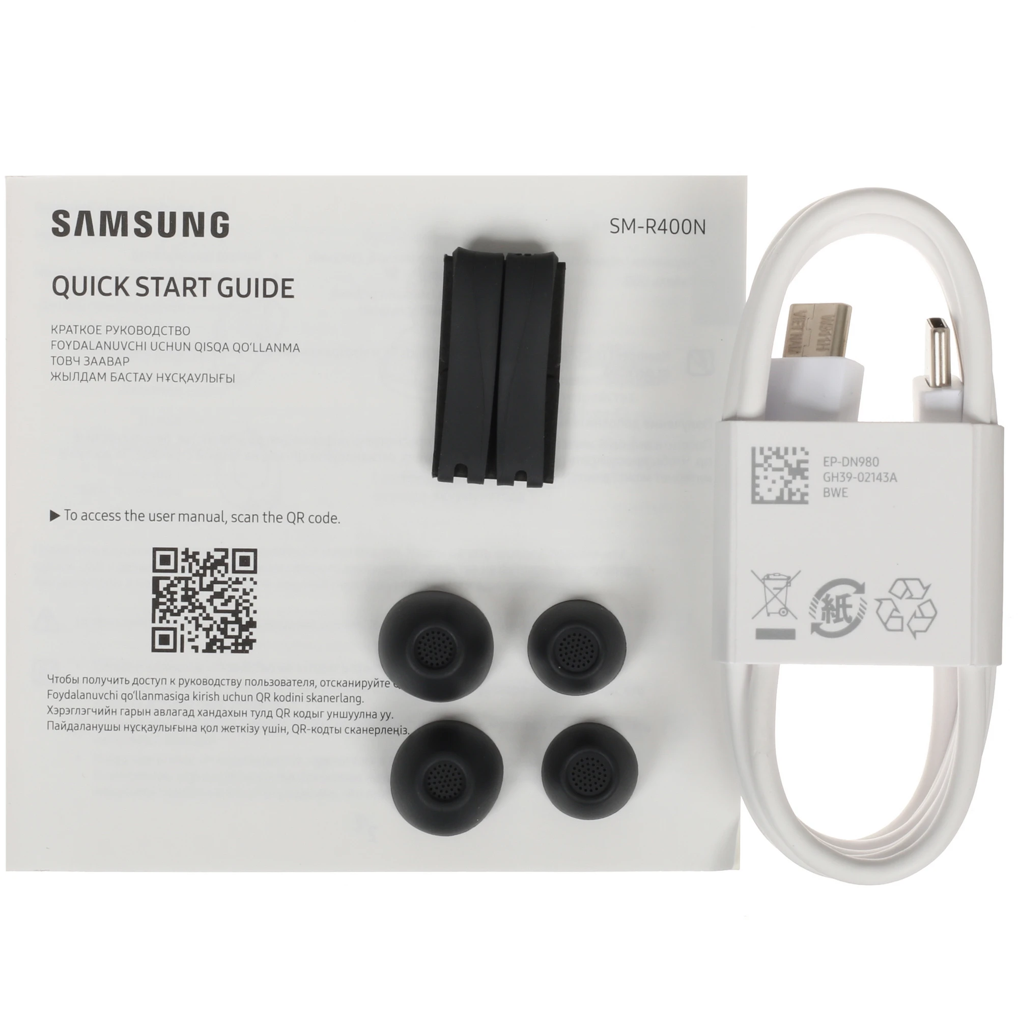 | Комплектация | Наушники Galaxy Buds FE, футляр-аккумулятор, 2 пары ушных держателей (дужки, размеры S/M и M/L), 3 пары амбушюр (размеры S,M и L), USB-кабель и краткое руководство пользователя. |