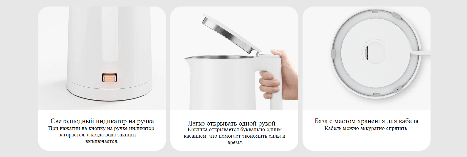 Благодаря вертикальной открытой ручке нажимать на переключатель после того, как вы поставите чайник, легче. Пользоваться чайником и наливать воду стало еще удобнее.