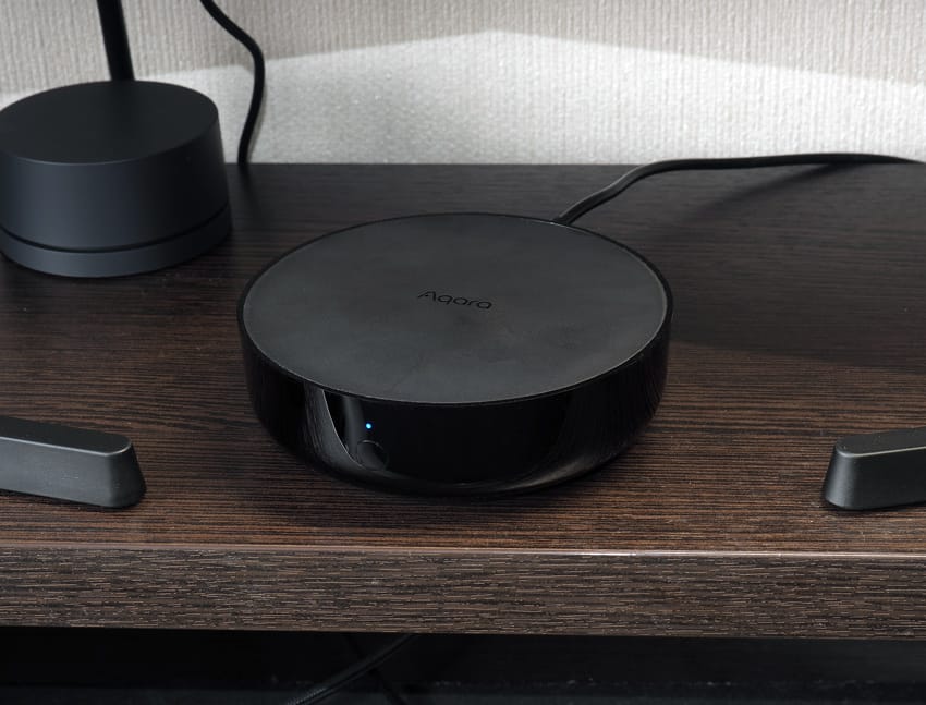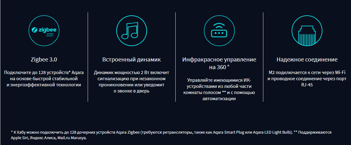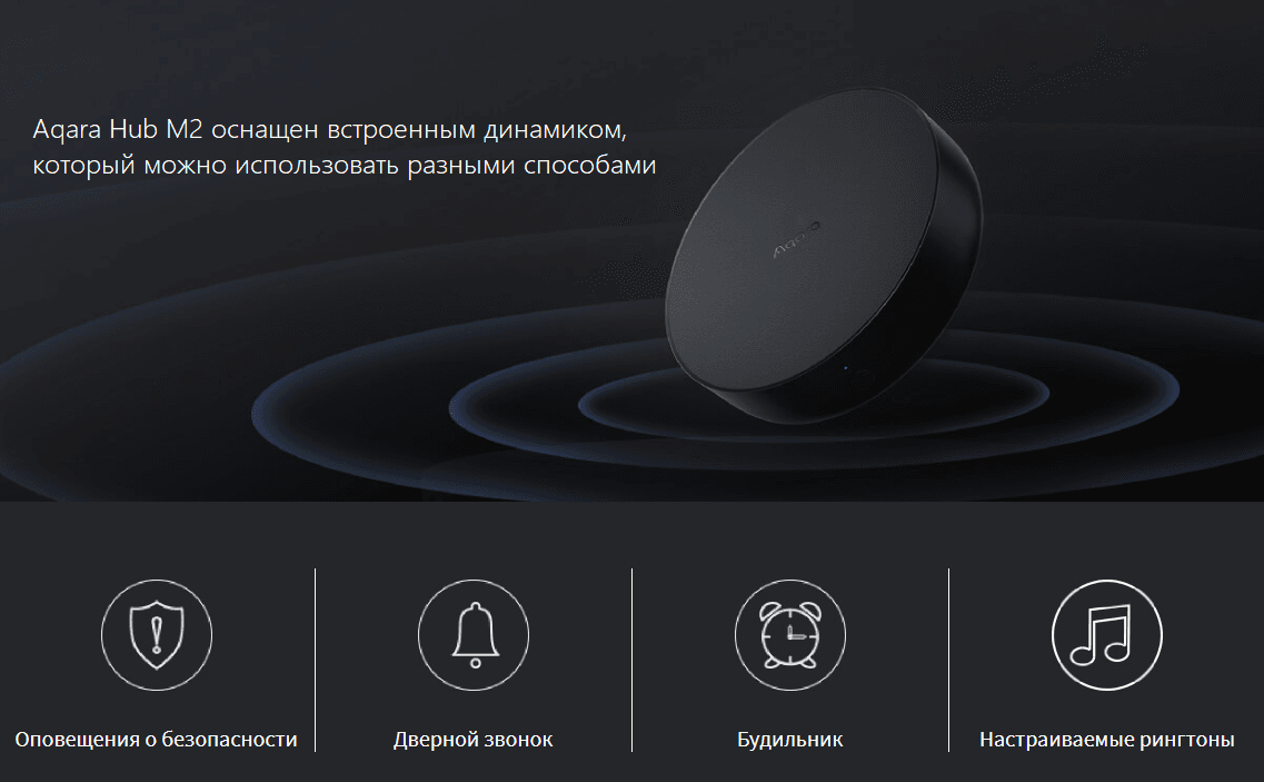 Компактный, поддерживает все устройства умного дома Aqara, есть встроенный динамик, управление через Алису