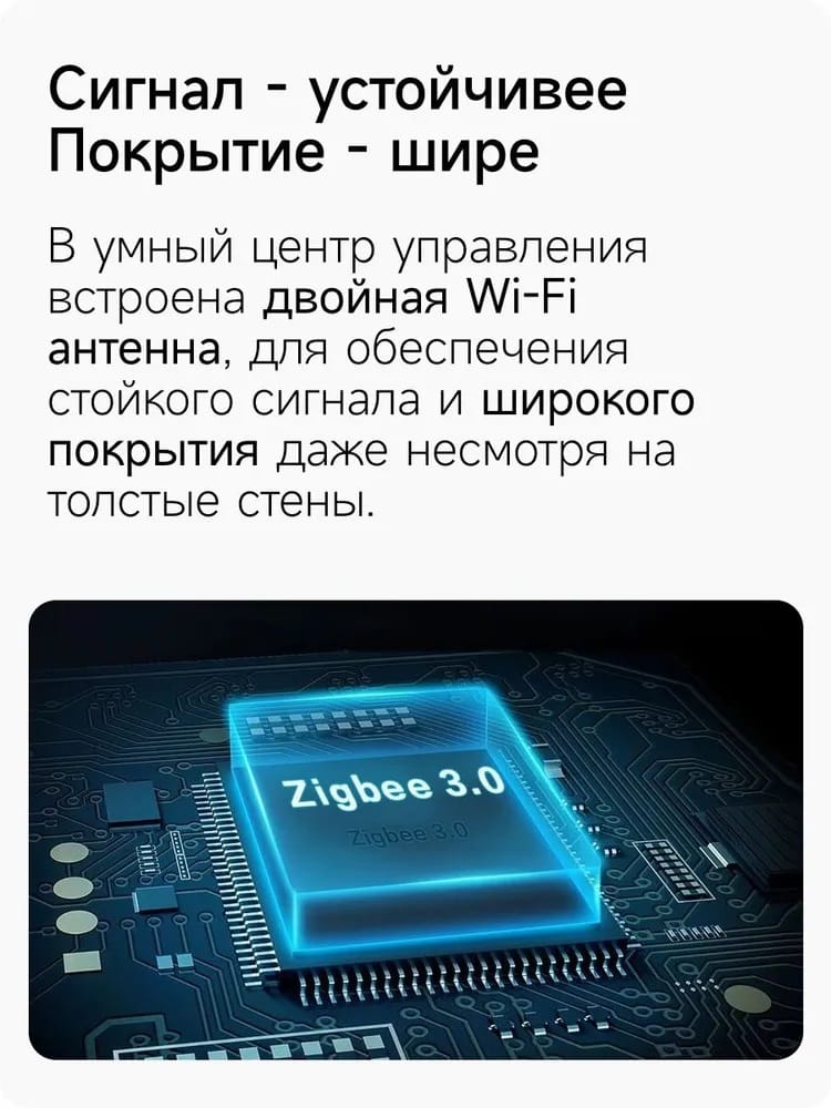 | Протокол связи с подключаемыми устройствами | Zigbee, Wi-Fi, Bluetooth |