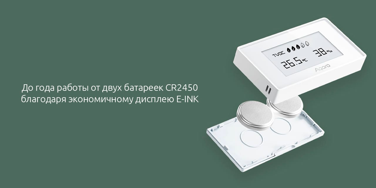 За счет энергоэффективного дисплея E-ink срок службы датчика без замены батареек составляет до 1 года. Датчик питается от двух батареек типа CR2450.