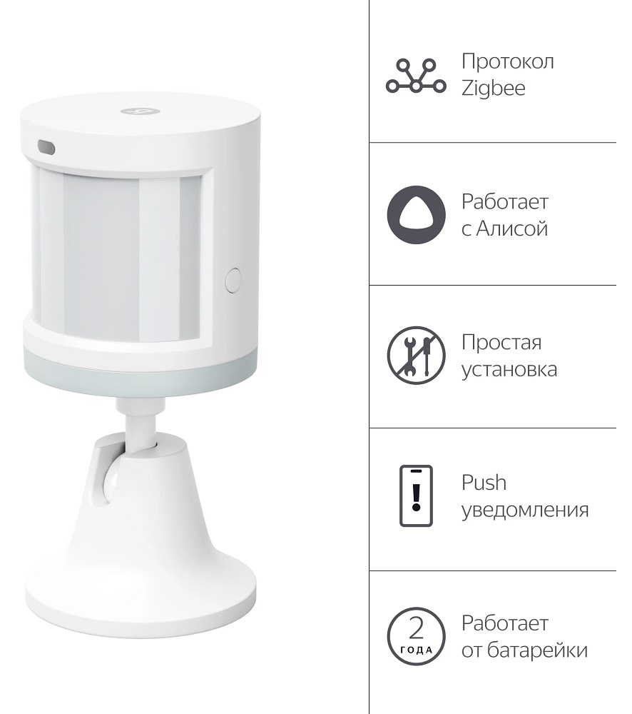 | Комплектация | Датчик движения и освещения Яндекс, поворотное крепление, стикер для монтажа, руководство пользователя |