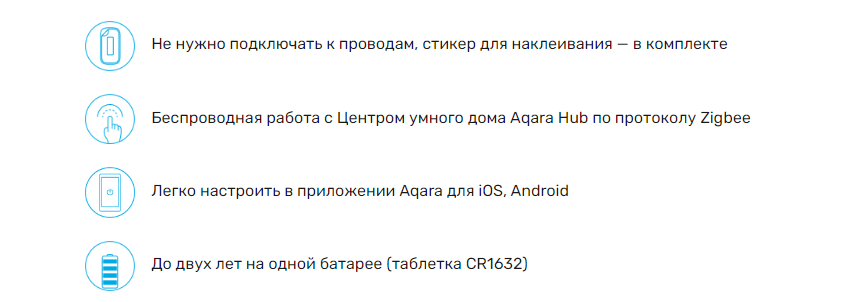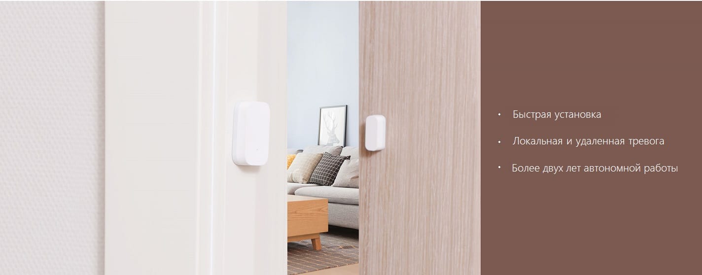 Устройство осуществляет контроль за положением дверей и окон при помощи активного сканирования дистанции между датчиком и магнитом. На работу гаджета не требуется много энергии, а одной одной батареи (таблетка CR2032) достаточно для 2 лет автономной работы.
