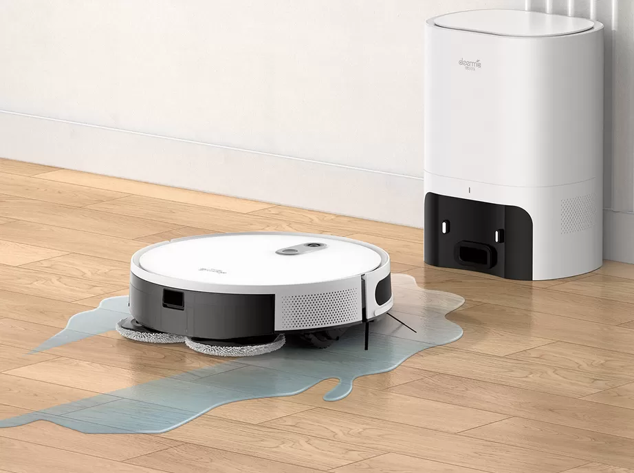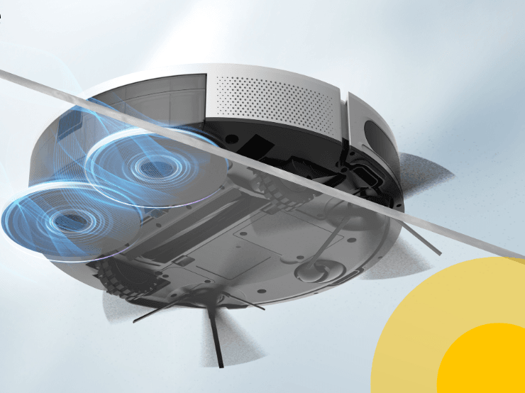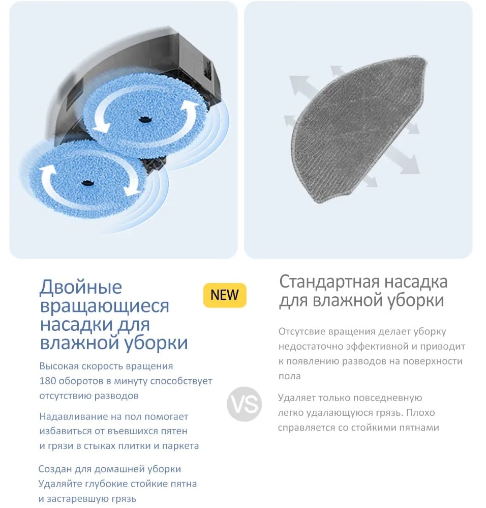 Во время влажной уборки имитируется процесс ручного мытья полов. Две щетки из микрофибры вращаются со скоростью до 180 оборотов в минуту, создавая давление до 10 Н. Вода заливается в резервуар объемом 300 мл. Интеллектуальная система точно дозирует уровень подачи жидкости.
