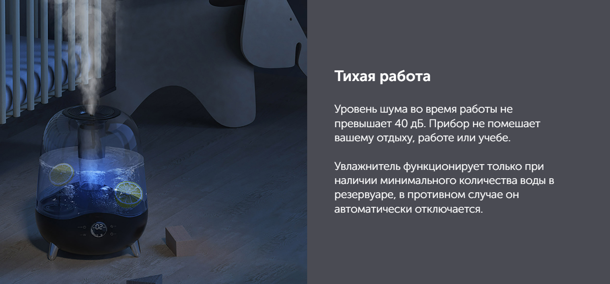 В целом хороший увлажнитель, работает действительно тихо, единственный минус , на мой взгляд, это то что подсветка не отключается, а светит он достаточно ярко.. но ребенку это спать не мешает так что все нормально)