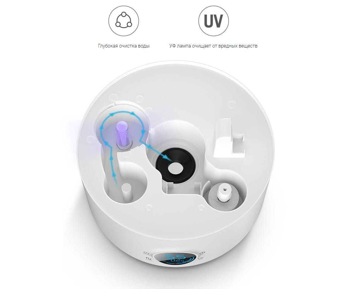Каждая капля распыляемой воды Deerma Humidifier F628S очищена от вредных веществ и неприятных запахов. Внутренняя часть увлажнителя представляет собой встроенный водный канал с усовершенствованной трубкой ультрафиолетовой очистки. После того как воду зальют в резервуар, она пройдет этап УФ очистки, и затем начнется распыление.