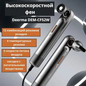 Высокоскоростной фен DEERMA DEM-CF52W отличный выбор для быстрой сушки любых волос. Скорость воздушного потока составляет 83км/ч, что делает сушку оперативной и качественной. Всего есть 4 температурных режима для любого типа волос. Так же есть возможность самому отрегулировать нагрев и воздушный поток. Управление феном совсем не сложно. Все кнопки располагаются спереди. Имеется 3 разных насадки.