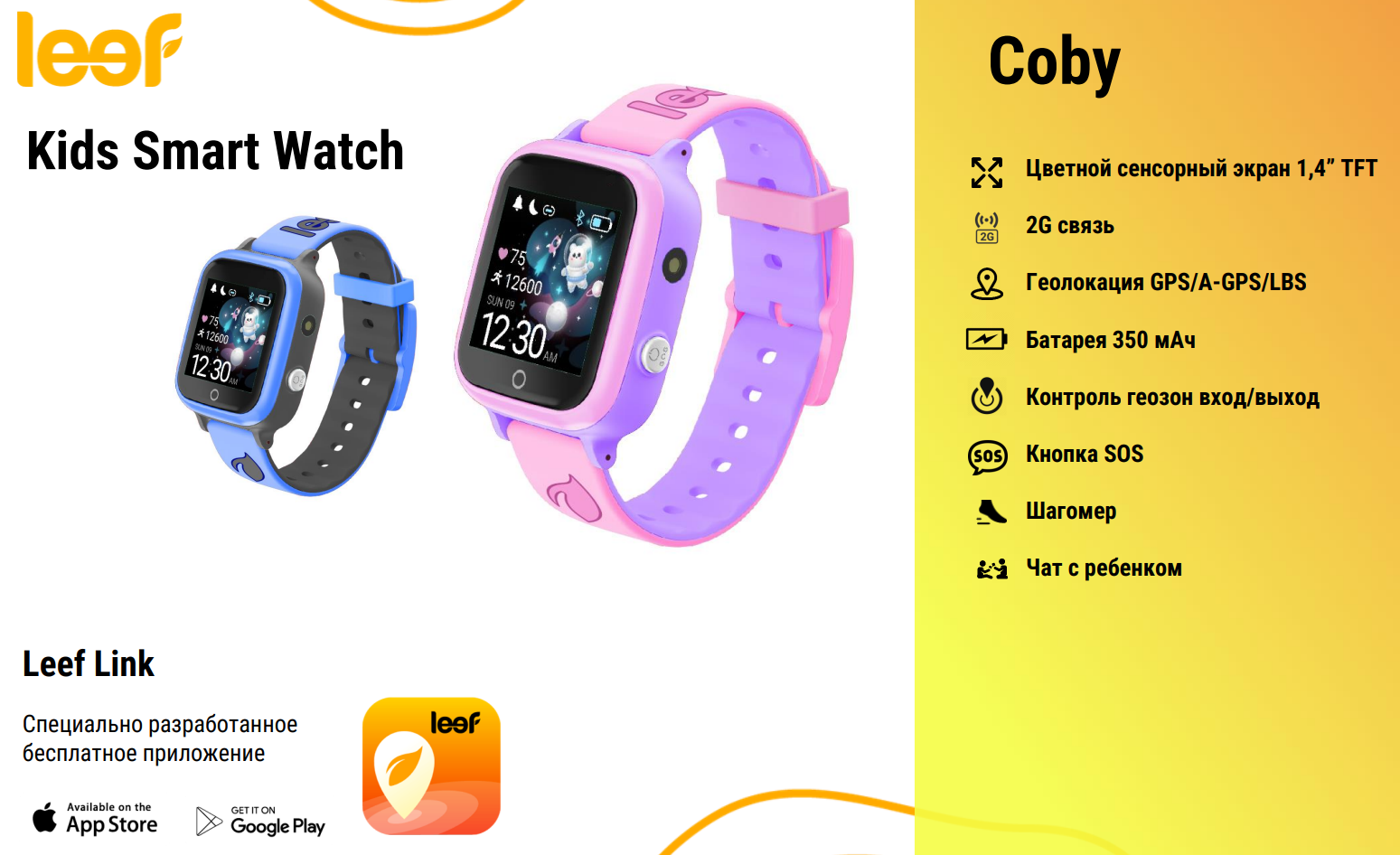 | Комплектация | Детские умные часы LEEF Coby, кабель для зарядки, инструкция |