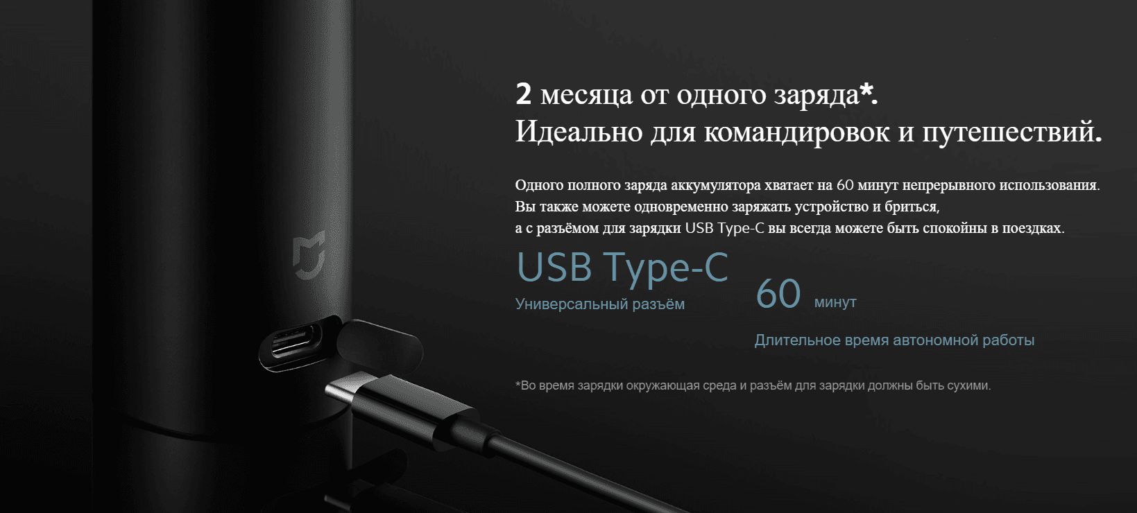 Одного полного заряда аккумулятора хватает на 60 минут непрерывного использования. Вы также можете одновременно заряжать устройство и бриться, а с разъёмом для зарядки USB Type-C вы всегда можете быть спокойны в поездках.