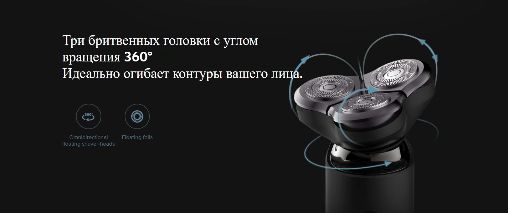Три бритвенных головки с углом вращения 360°