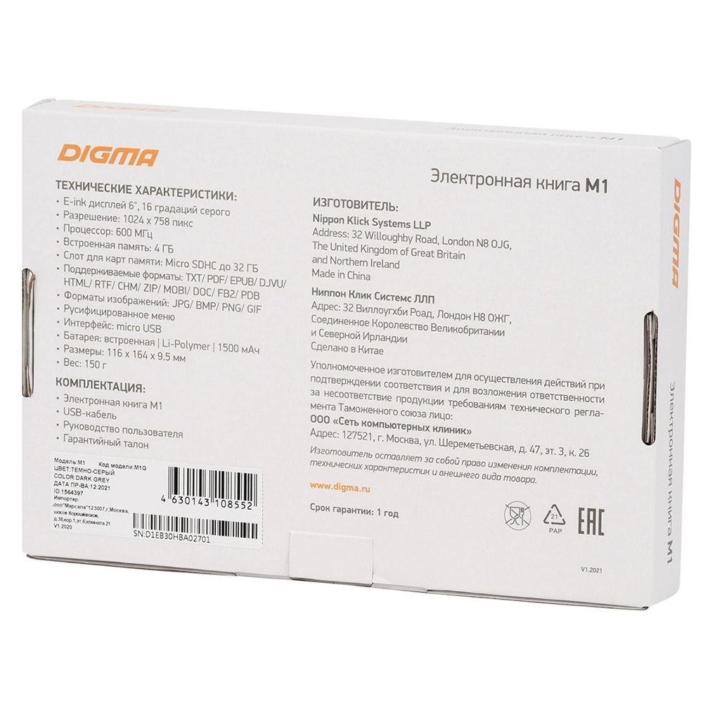 Электронная книга Digma M1 6″ E-ink HD Pearl 128Mb/4Gb темно-серый