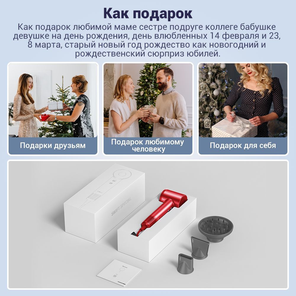 | Комплектация | Фен Swift Special, насадки 3 шт (насадка-концентратор, моделирующая насадка, насадка-диффузор), инструкция |