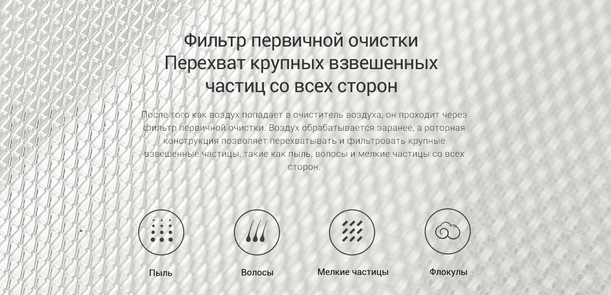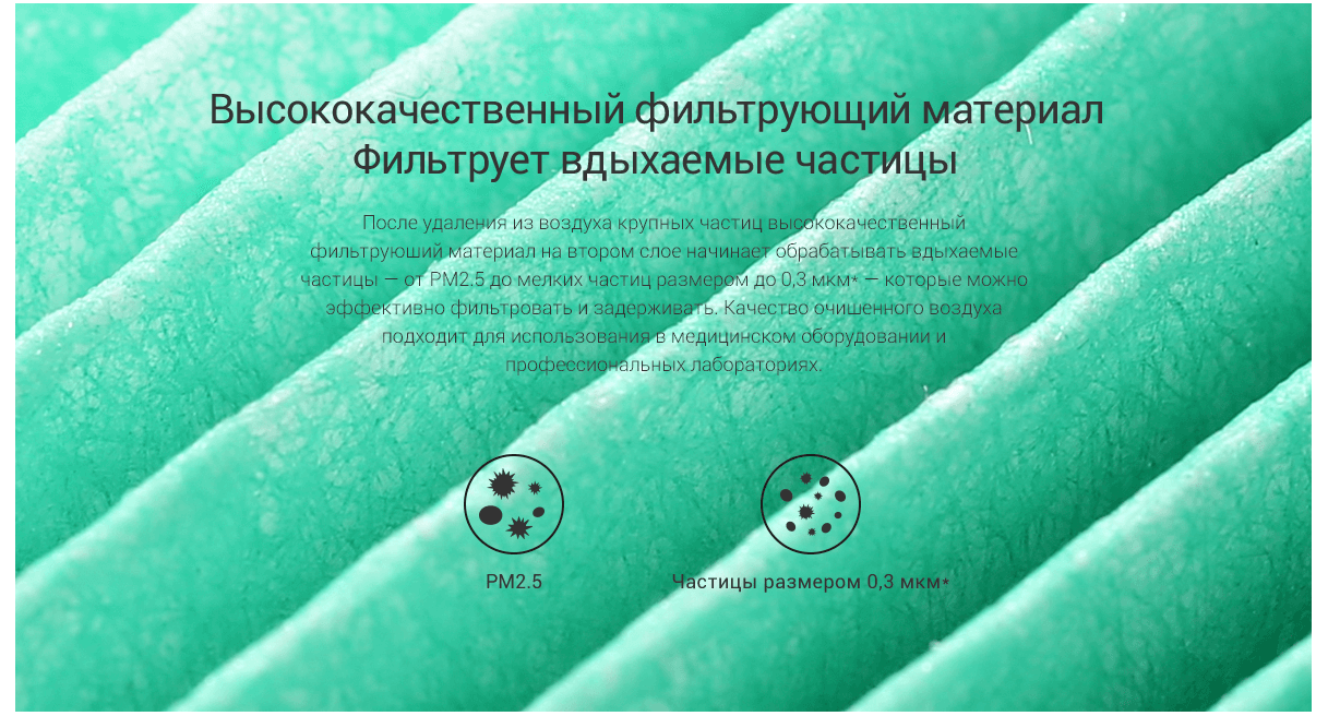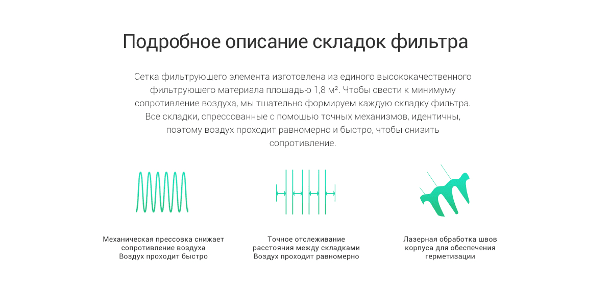 Сетка фильтрующего элемента изготовлена из единого высококачественного фильтрующего материала площадью 1.8 м2. Чтобы свести к минимуму сопротивление воздуха, Xiaomi тщательно формирует каждую складку фильтра. Все складки, спрессованные с помощью точных механизмов, идентичны, поэтому воздух проходит равномерно и быстро, чтобы снизить сопротивление.