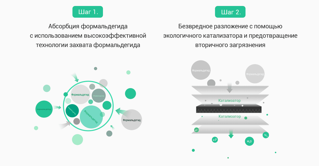 Благодаря высокоэффективной технологии захвата формальдегида он прочно адсорбируется на улавливателях альдегида, что затрудняет десорбцию вредных молекул. Из-за высокой адсорбирующей способности формальдегида традиционным активированным углем добавлена каталитическая формула, а также используется катализатор. В процессе очистки катализатор может разлагать формальдегид на воду и углекислый газ. Материалы, образуемые после разложения, вступают в реакцию с кислородом для регенерации катализатора, который перерабатывается для последующего разложения формальдегида и других вредных веществ.