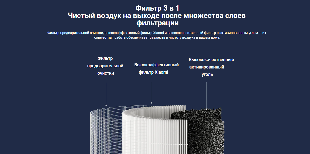 Для очистки используется тройная система фильтрации: фильтр предварительной очистки, высокоэффективный фильтр и высококачественный фильтр с активированным углем.