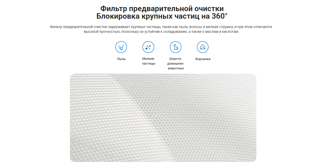 Фильтр предварительной очистки обеспечивает первичную фильтрацию пыли, шерсти питомцев, мелких и крупных частиц, а также устойчив к маслу, кислотам, щелочам и другим веществам, что продлевает его срок службы.