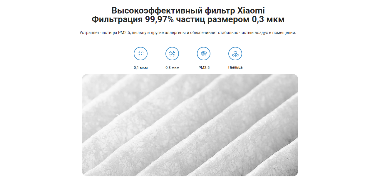 Высокоэффективный фильтр устраняет частицы PM2.5, пыльцу и другие загрязнения и обеспечивает стабильно чистый воздух в помещении. При фильтрации эффективность удаления частиц диаметром от 0,3 мкм составляет 99,97%.