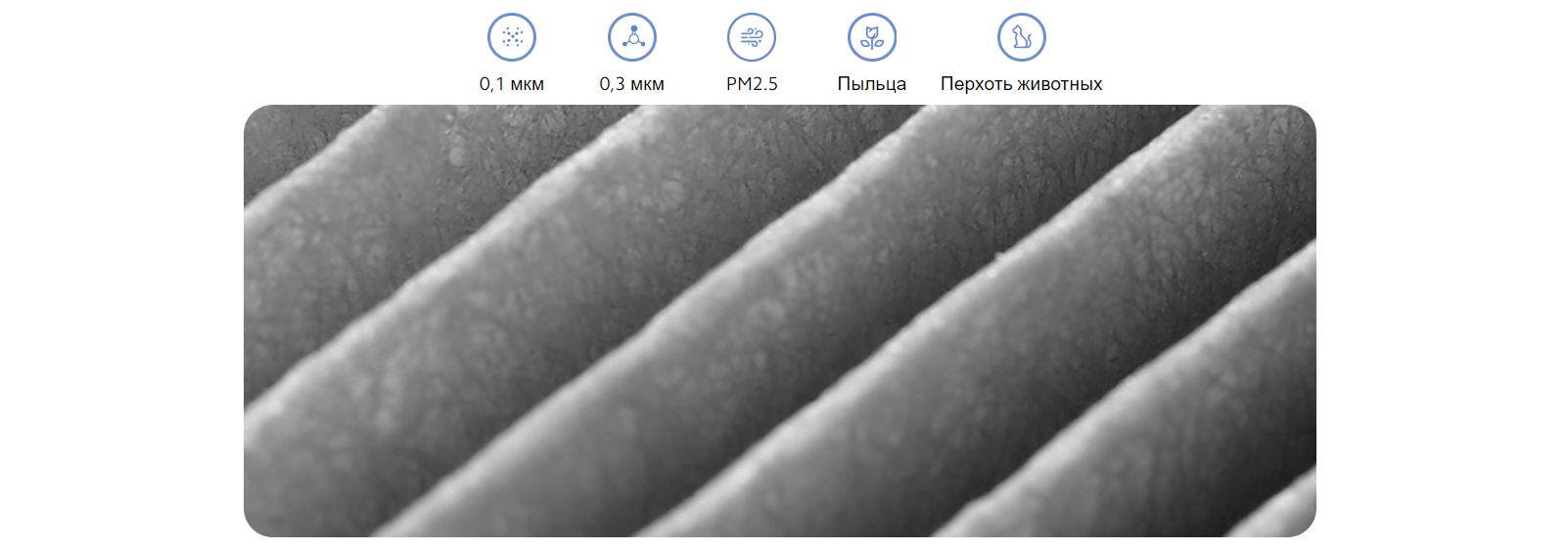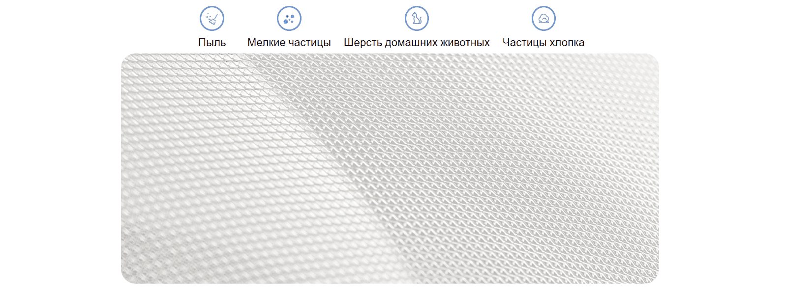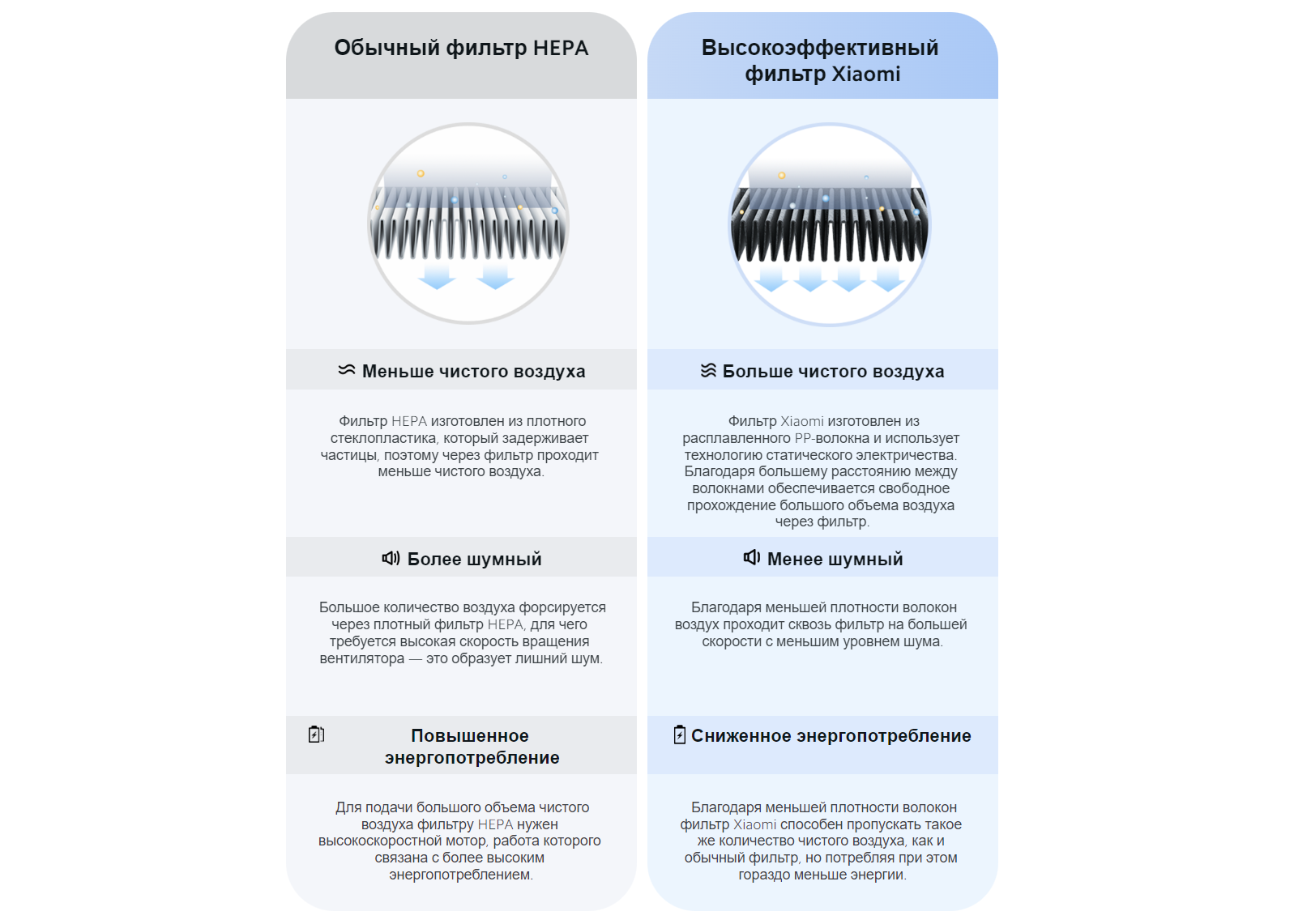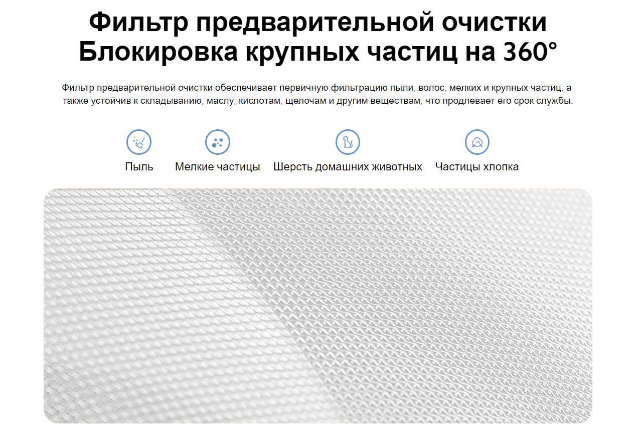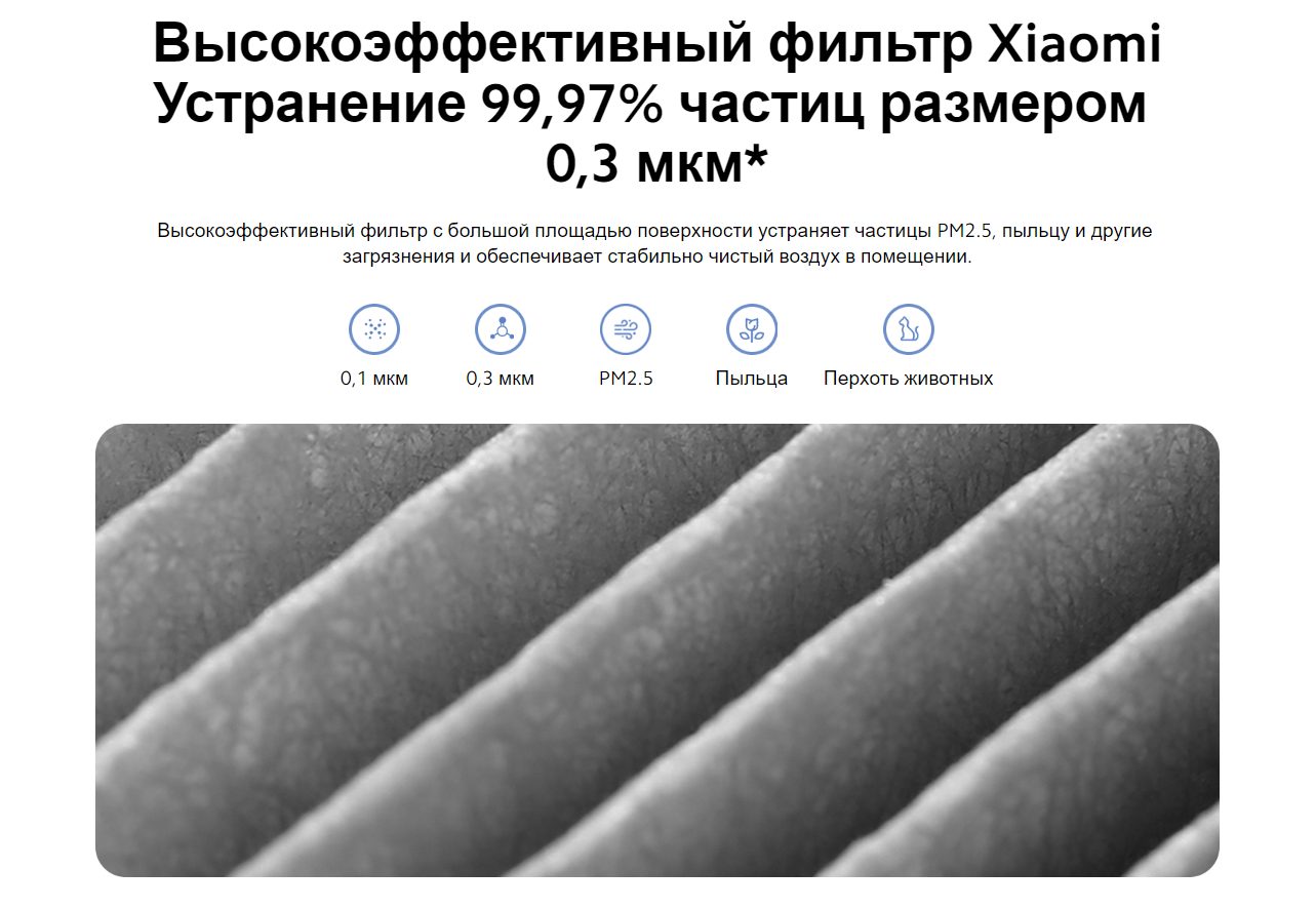 Две технологии фильтрации. Электростатическая и механическая фильтрация. Высокоэффективный фильтр Xiaomi может удалять до 99,97% содержащихся в воздухе частиц размером до 0,1 мкм, а также задерживает пыль, частицы PM2.5, пыльцу, перхоть домашних животных, табачный дым и мельчайшие микропластики. Для частиц размером до 0,3 мкм высокоэффективный фильтр Xiaomi обеспечивает результативность 99,97%, а для частиц размером 0,1 мкм эффективность фильтрации составляет до 99,99%.