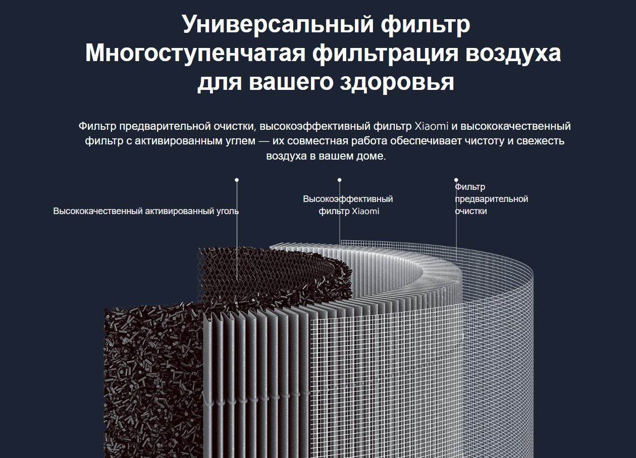 Фильтр предварительной очистки, высокоэффективный фильтр Xiaomi и высококачественный фильтр с активированным углем — их совместная работа обеспечивает чистоту и свежесть воздуха в вашем доме.