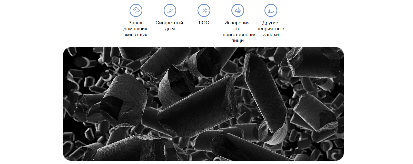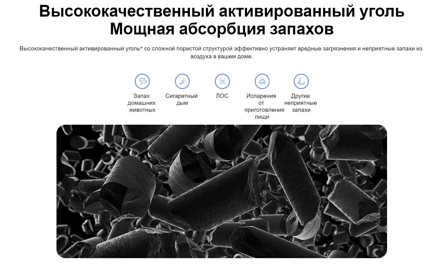 Высококачественный активированный уголь со сложной пористой структурой эффективно устраняет вредные загрязнения и неприятные запахи из воздуха в вашем доме.
