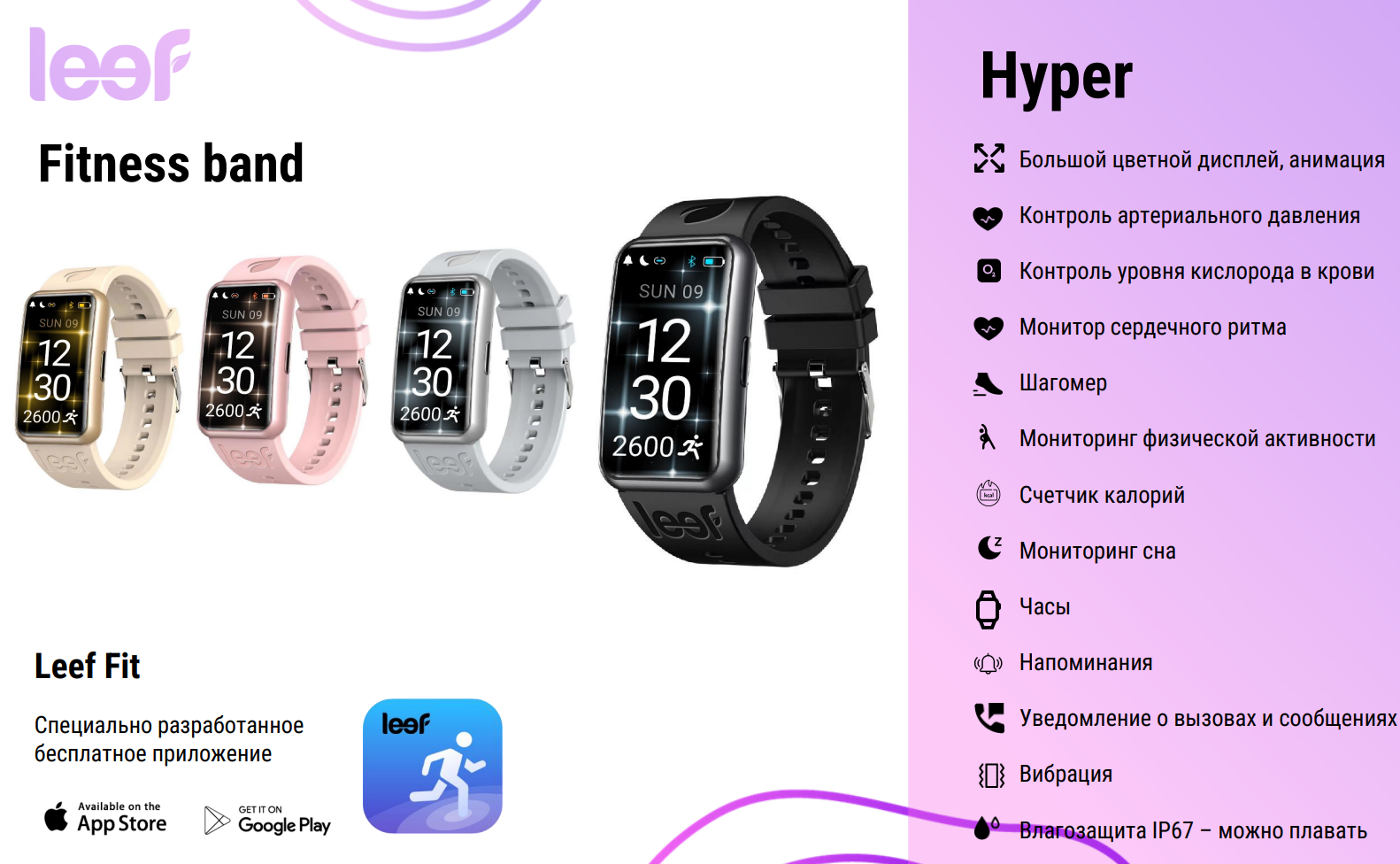 | Комплектация | Фитнес-трекер LEEF Hyper, кабель, инструкция |