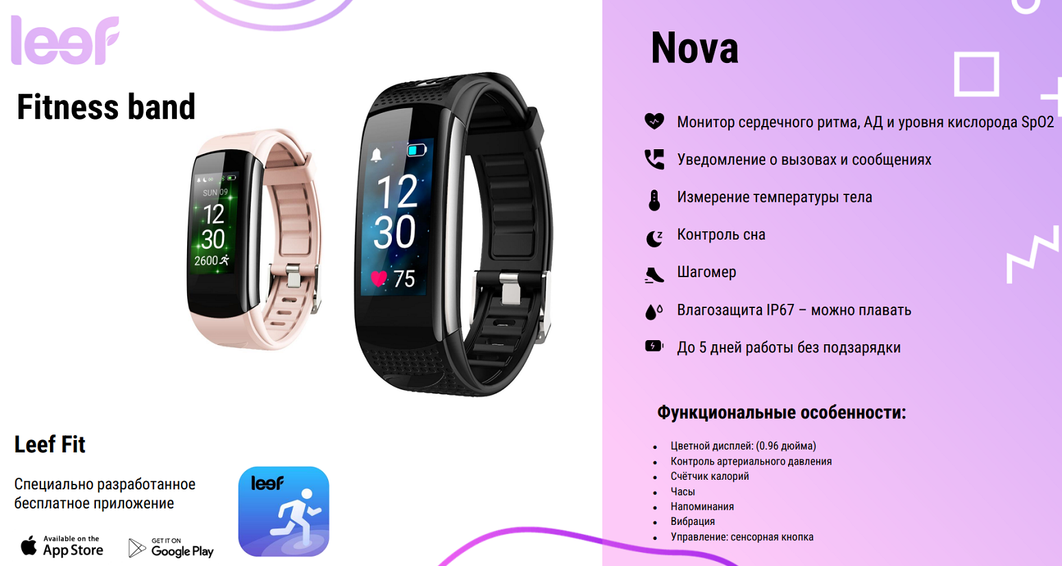 | Комплектация | Фитнес-трекер LEEF Nova, документация |