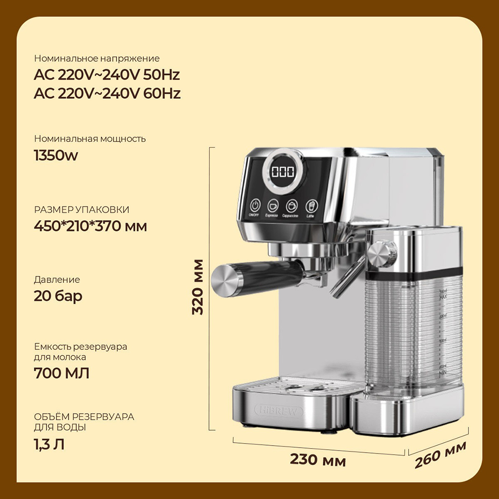 Кофемашина Hibrew H13A – ваш незаменимый помощник для создания идеального кофе. Устройство оснащено удобной системой управления и высоким уровнем мощности, гарантирующим быструю и качественную обработку зерна. Используй режимы кофемашины для приготовления эспрессо, латте, капучино, горячего шоколада и многого другого. Компактные размеры устройства позволят ему легко вписаться в любое пространство.