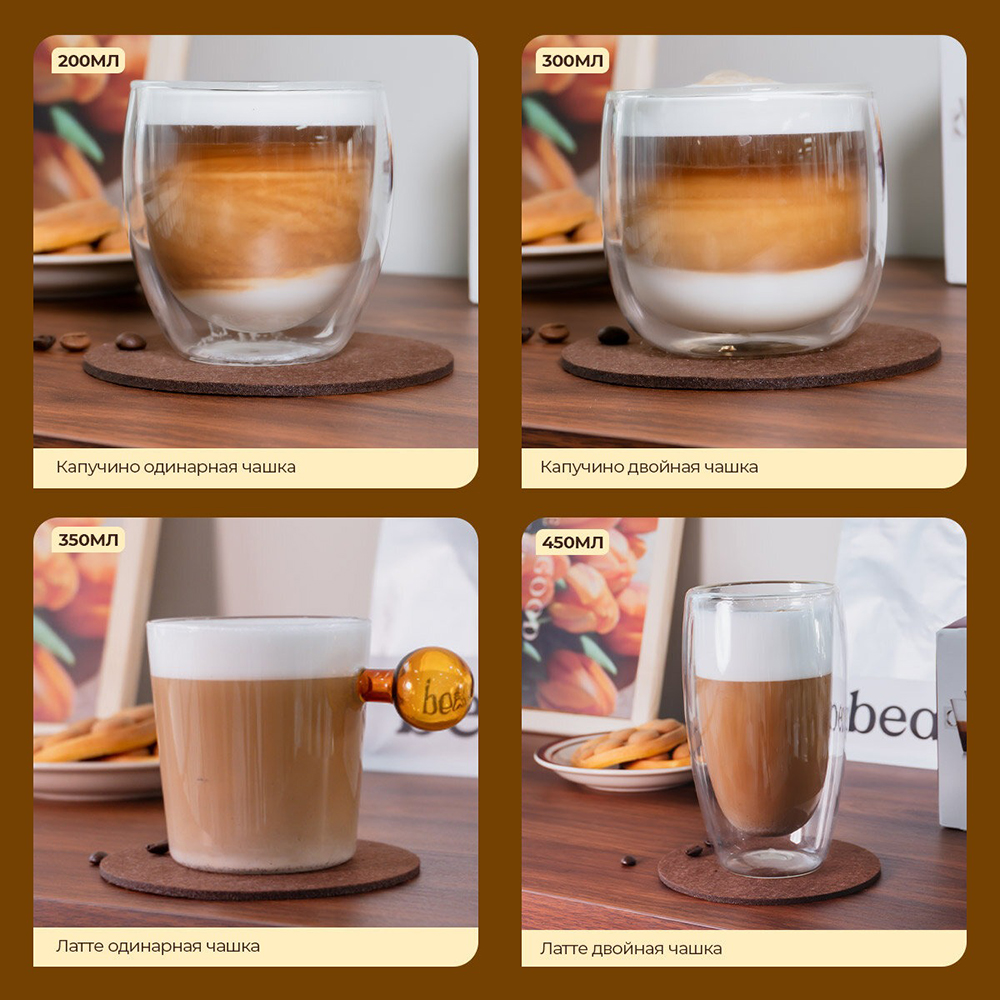 | Виды напитков | Капучино, Латте, Эспрессо |