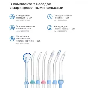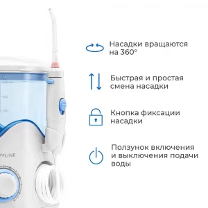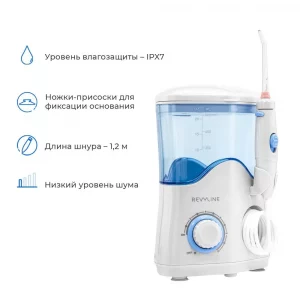 Ирригатор Revyline RL 100 лучший выбор для сохранения здоровой полости рта. Простой в использовании, но очень многофункциональный аппарат может блестяще чистить межзубные промежутки, пришеечную область зубов и десневую область, а все это благодаря сочетанию пульсирующей технологии подачи воды и высокому давлению. Насадки способны раскрутиться на 360 градусов, что помогает отчистить даже самые недоступные места. Есть 10 режимов давления. Имеется крышка-пенал для хранения 7 насадок, который сохранит их в целости.