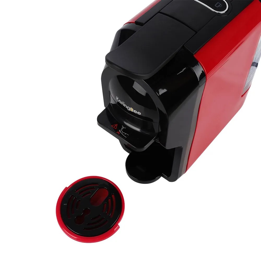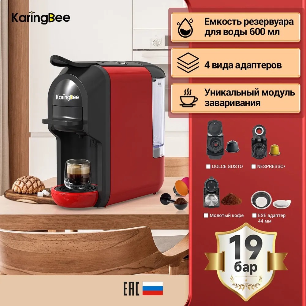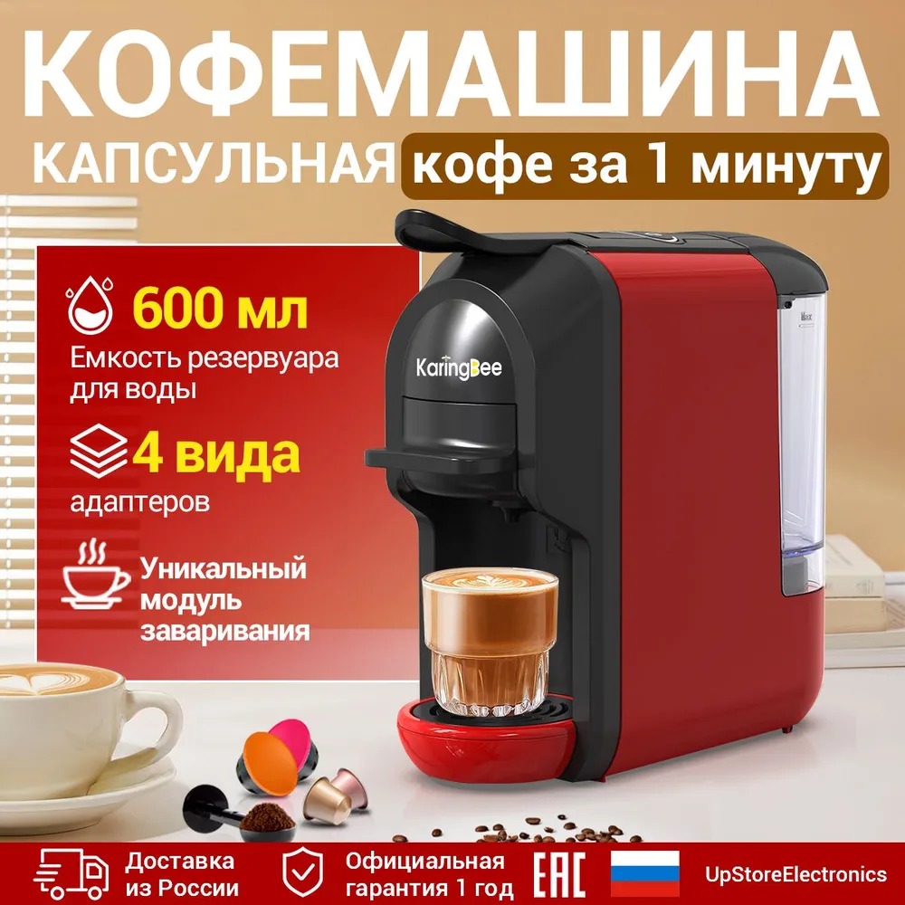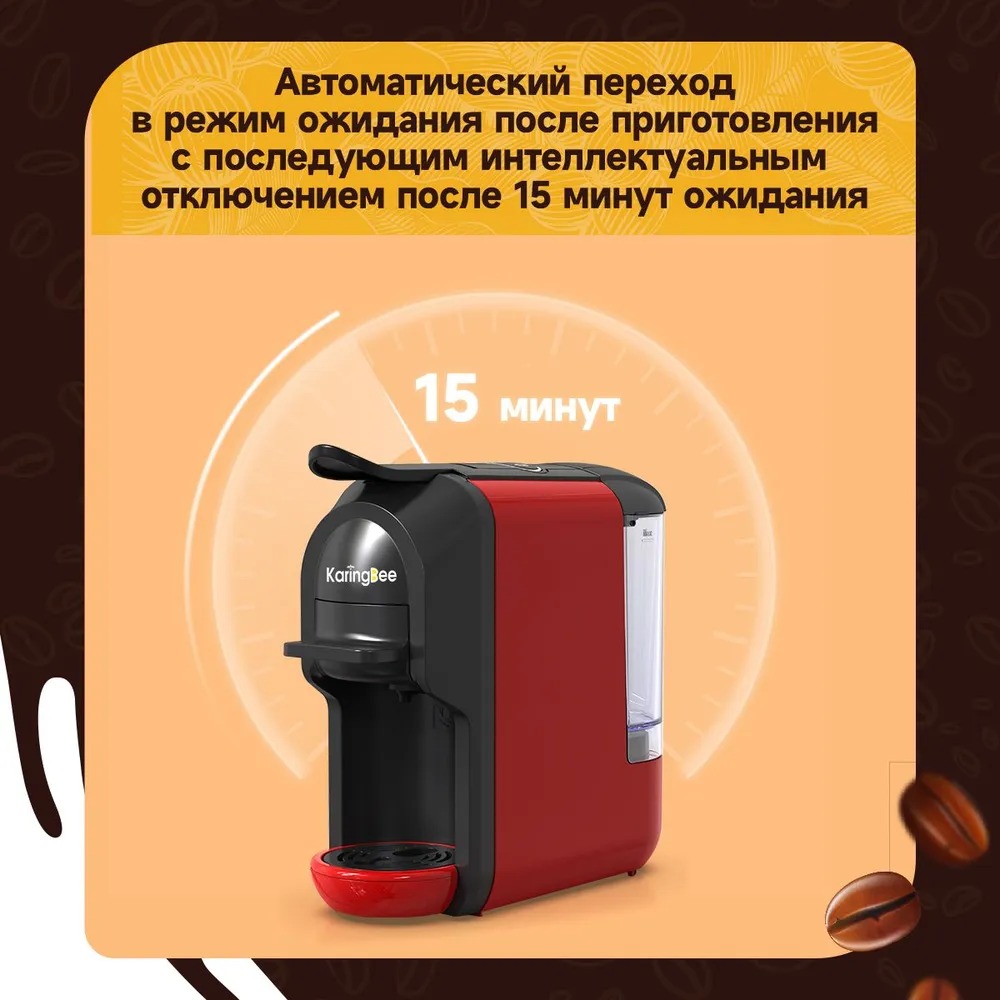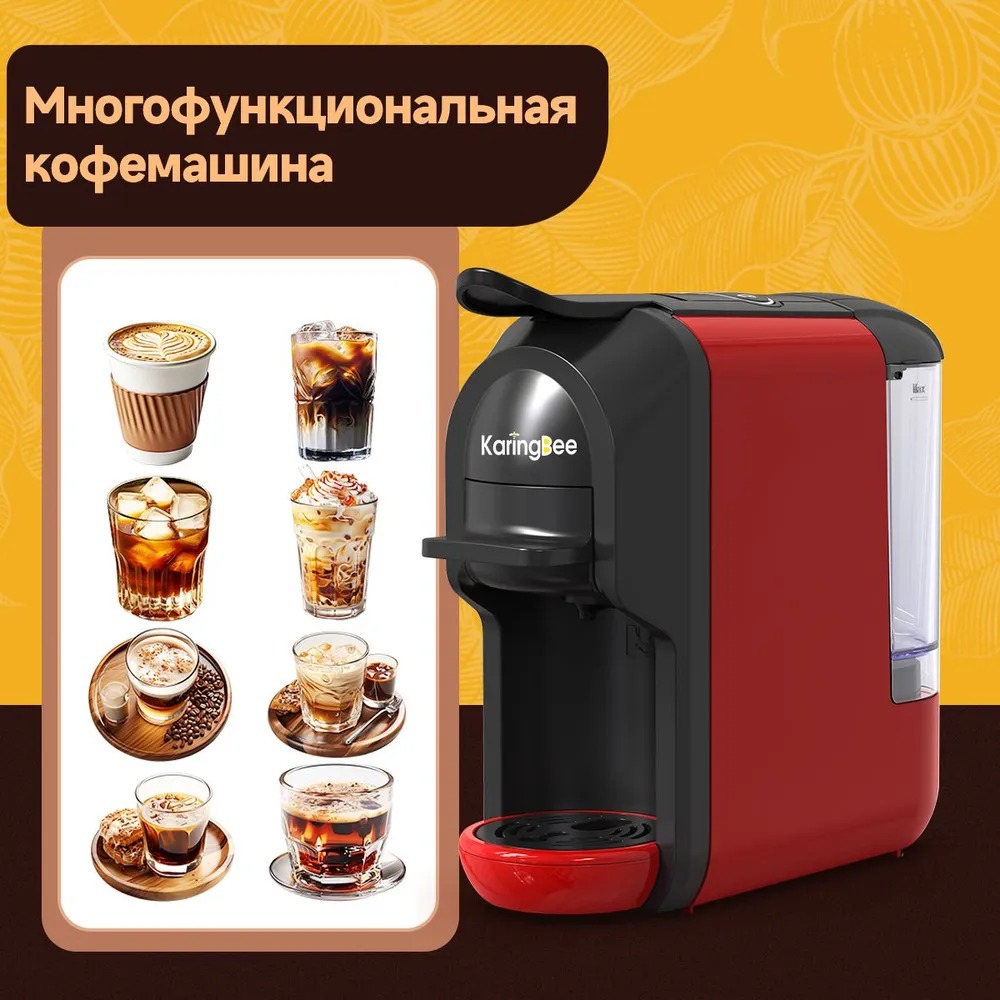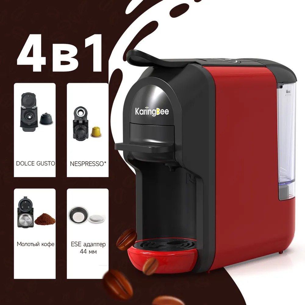 Кофемашина KaringBee ST–510 быстро готовит горячий кофе американо и эспрессо. Для этого она использует капсулы Nespresso, Dolce Gusto и молотый кофе. Имеется кнопочная панель для регулировки объема и крепости напитка. Объем резервуара для воды составляет 600 мл., благодаря которому воду не приходится менять слишком часто.
