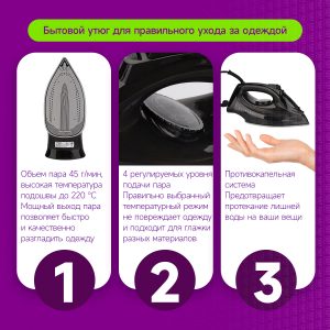 Утюг KaringBee KB-EI003 многофункциональный и профессиональный утюг способен разгладить даже самую мятую ткань. Имеется функция парового удара, что позволяет сильнее воздействовать на ткань и эффективнее выполнить свою работу. Функция сухого глажения дает быстрее разгладить даже самые проблемные места. Функция распыления так же ускоряет процесс работы. Поверхность утюга оснащена антипригарным покрытием, оно поможет оставить ткань в целости. Для продления срока службы утюга в него встроена функция самоочищения. Можно настроить оптимальную температуру самостоятельно под любую ткань и одежду.