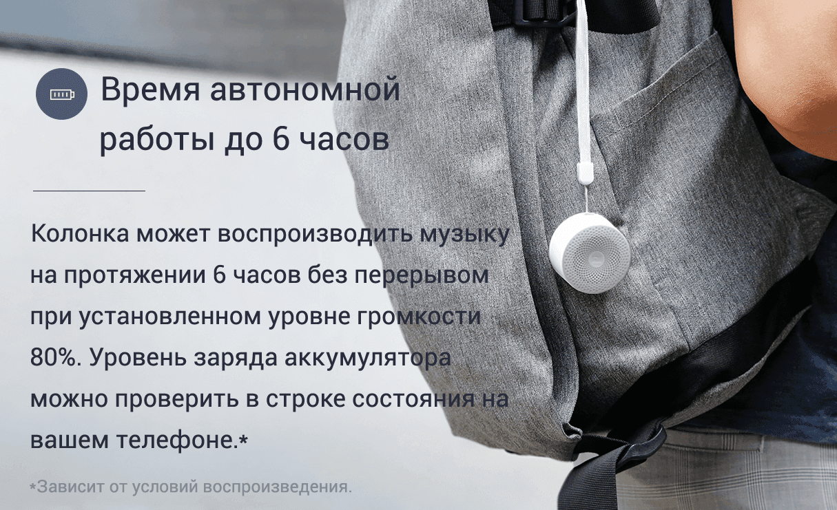 При весе всего 54 грамма и небольших габаритах компактную колонку Xiaomi можно без труда взять с собой или использовать комплектный шнурок для подвески.