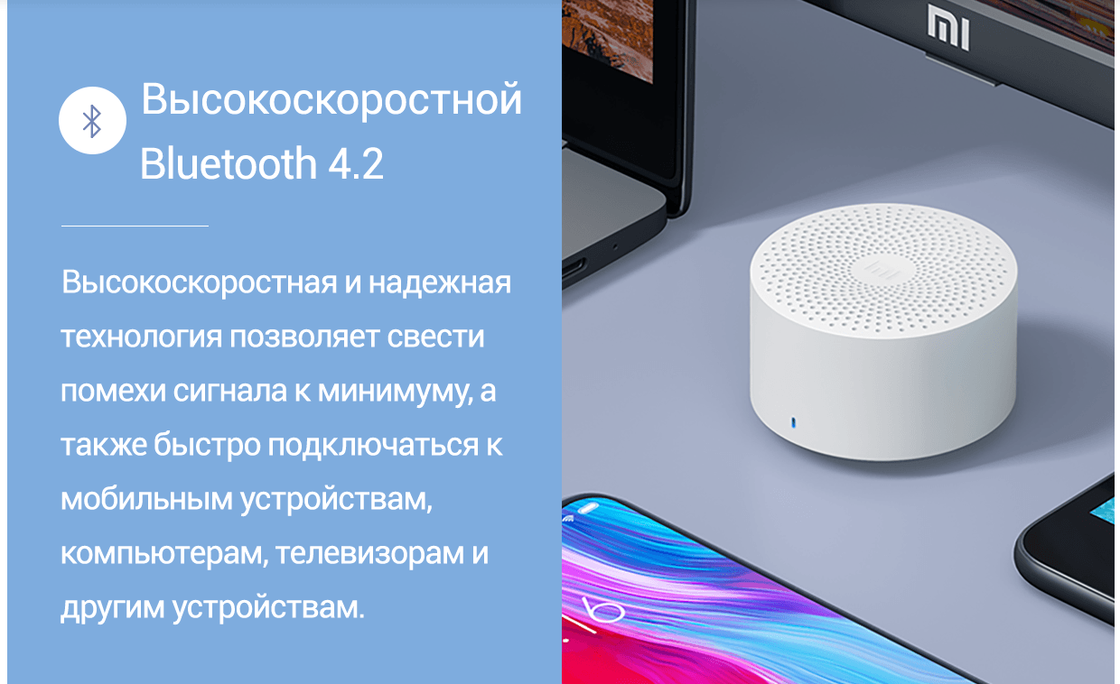 Компактная колонка Xiaomi поддерживает подключение по Bluetooth 4.2, обеспечивая устойчивое и быстрое соединение, не боящееся помех. К ней можно подключить смартфон, компьютер, телевизор и любое другое устройство всего за пару шагов.