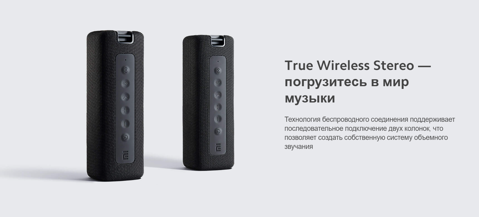 Технология беспроводного соединения поддерживает последовательное подключение двух колонок, что позволяет создать собственную систему объемного звучания