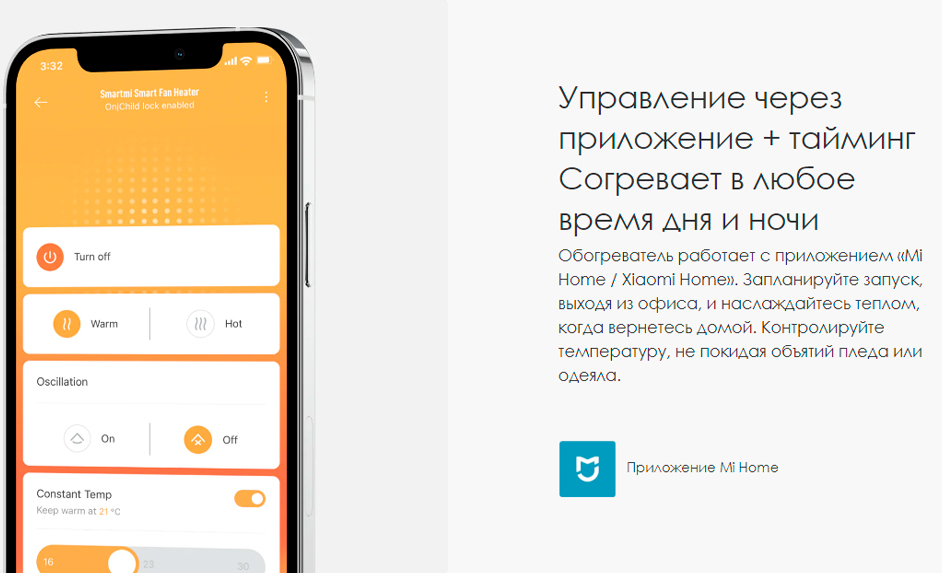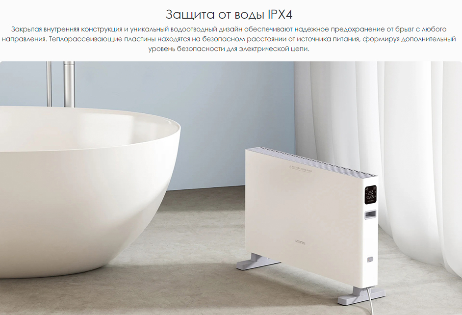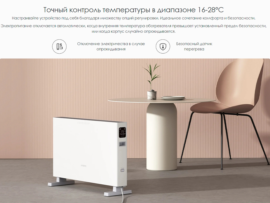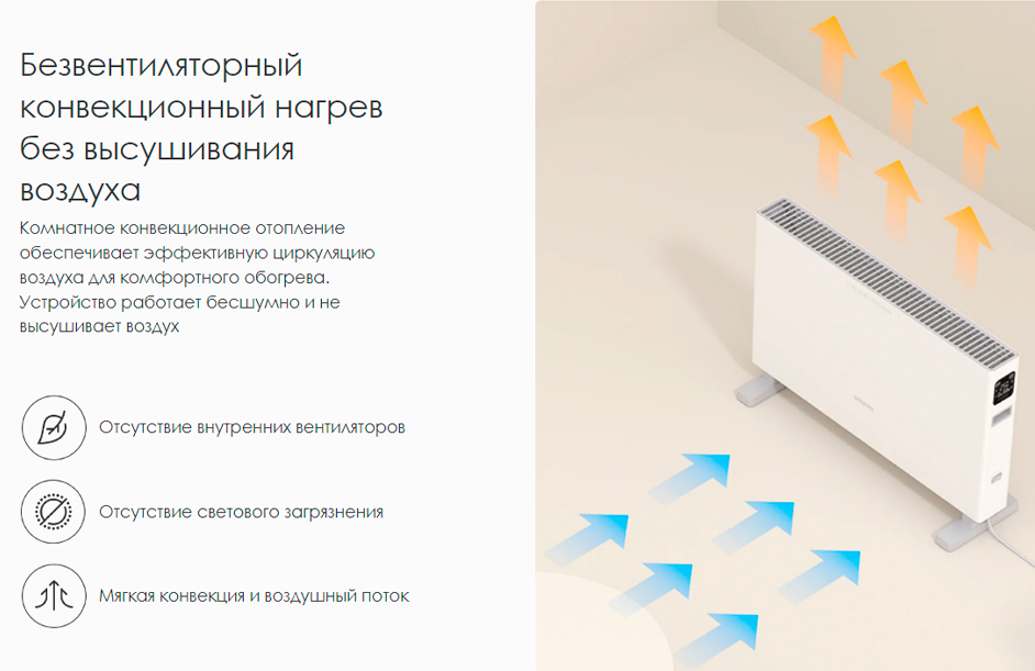 | Особенности | Безвентиляторный конвекционный нагрев без высушивания воздуха, умный контроль температуры, управление через смартфон, экосистема умного дома Mi Home, выключение при опрокидывании |